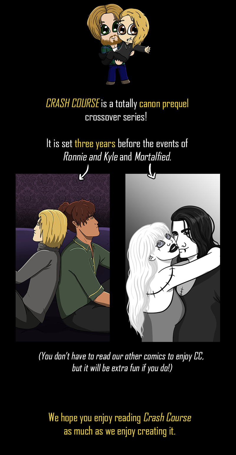 Welcome! This is a fun cross-over project for Curly & I. My main series, Ronnie and Kyle, is available here on Tapas. Her series Mortalfied is only available on Webtoon at the moment, but may someday change.