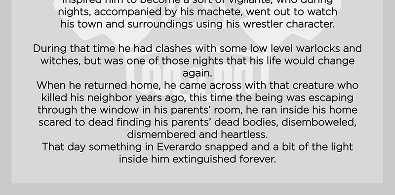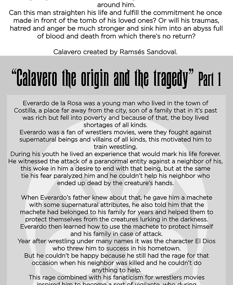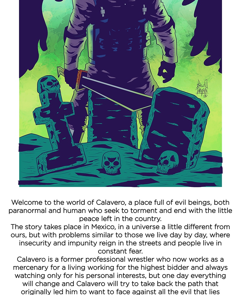 Calavero is a former wrestler turned into a mercenary after loosing his loved ones in a tragic way, he's been killing human and magical beings to make a living. During his path of blood his humanity has been slowly vanishing, but soon he'll have to face the consequences of terrible acts of his past.