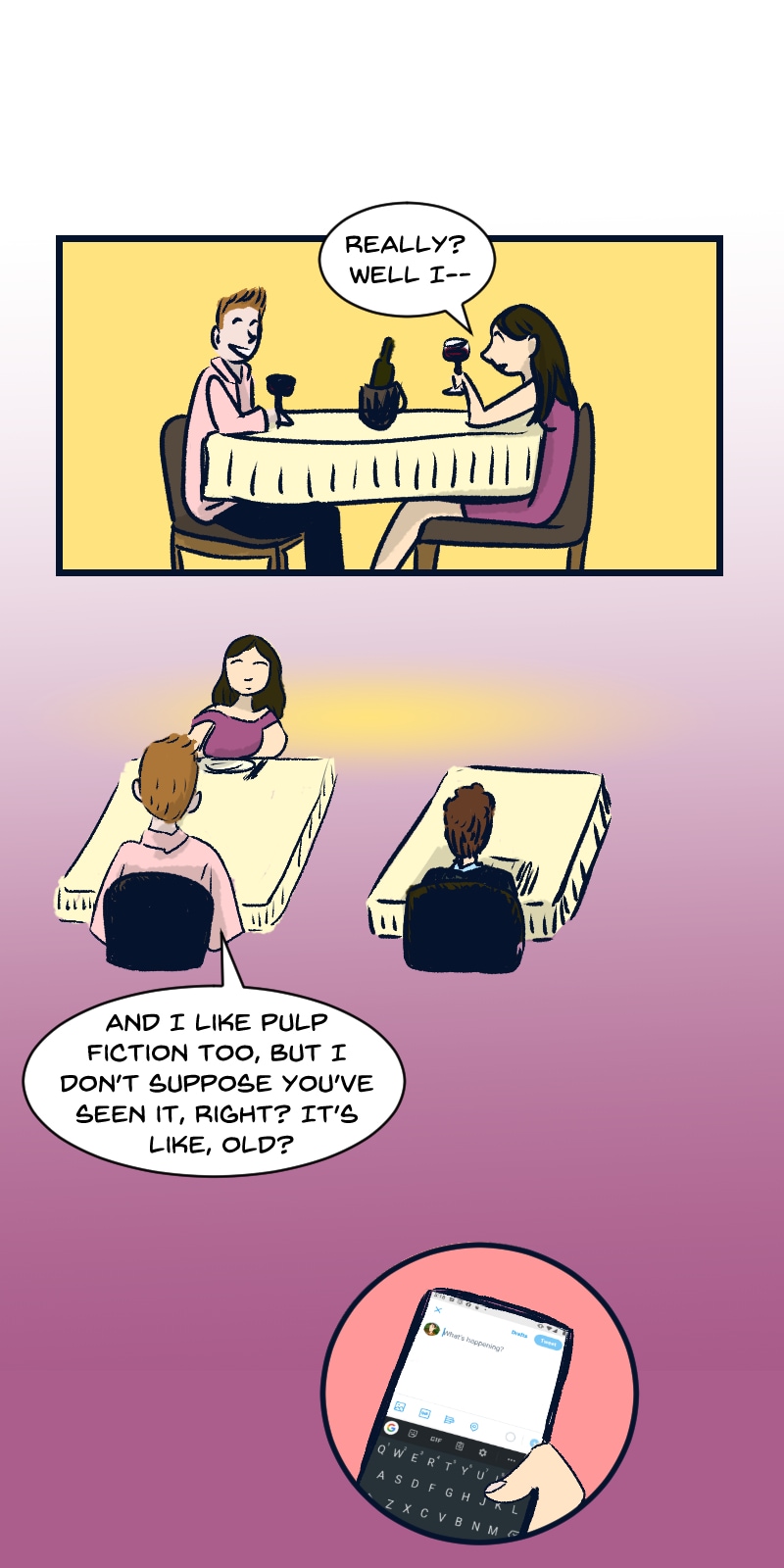 Part webcomic, part Social Media Storytelling: one sad cynical boy who does Not believe in love learns to Feel Emotions again after a chance encounter with a well intentioned and excitable Nerd (who is a grad student in medieval studies, hence that aesthetic influence.)