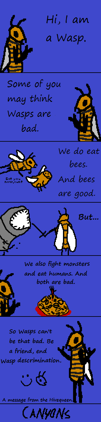Just a little taste of the kind of humor found in Canyons. Although, the main two characters are human, so you will have to ask for more Wasp stuff. Wasps are really fun to draw and write for, so if you want more Wasp, just ask.