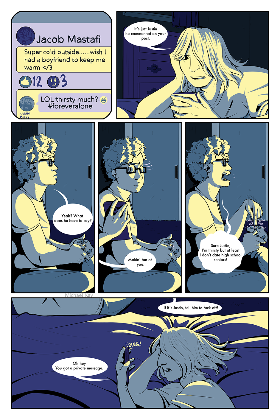 Woh I loooove the colors !!! These two seems really close, only good friends can answer comments & messages for you ! I love the flow in the panels it's really nice !! I want to know more about the story !