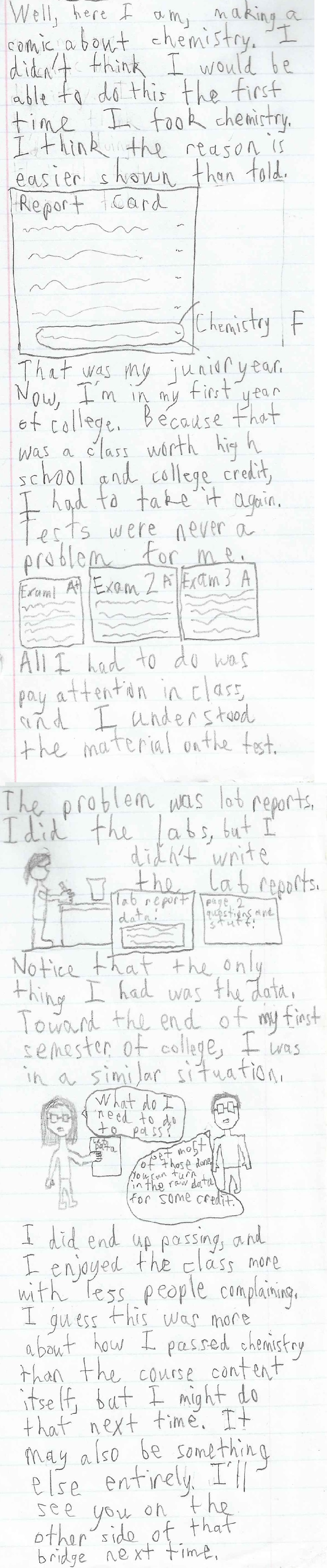 This is a comic about my life as a student who failed chemistry in high school. I had to retake it in college, but if I hadn't, I wouldn't be majoring in chemistry now. I will include anything from my life that I feel inspired to make a comic about. I'm sorry if my art isn't the greatest and if it gets a bit text-heavy at times, but I am coming into this art form from trying to write novels. Also, I'm using notebook paper and a mechanical pencil and this is the most I've drawn in a while, so please be patient as my art slowly improves.
