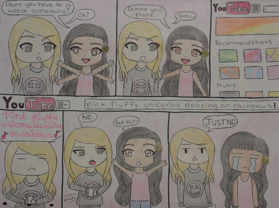 This is a chibi manga of my friend's reaction to Pink Fluffy Unicorns Dancing on Rainbows lol Oh and its left to right =3