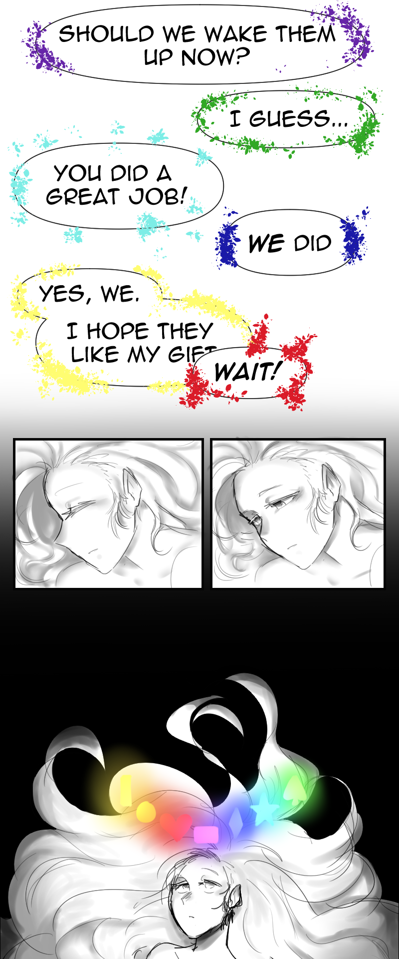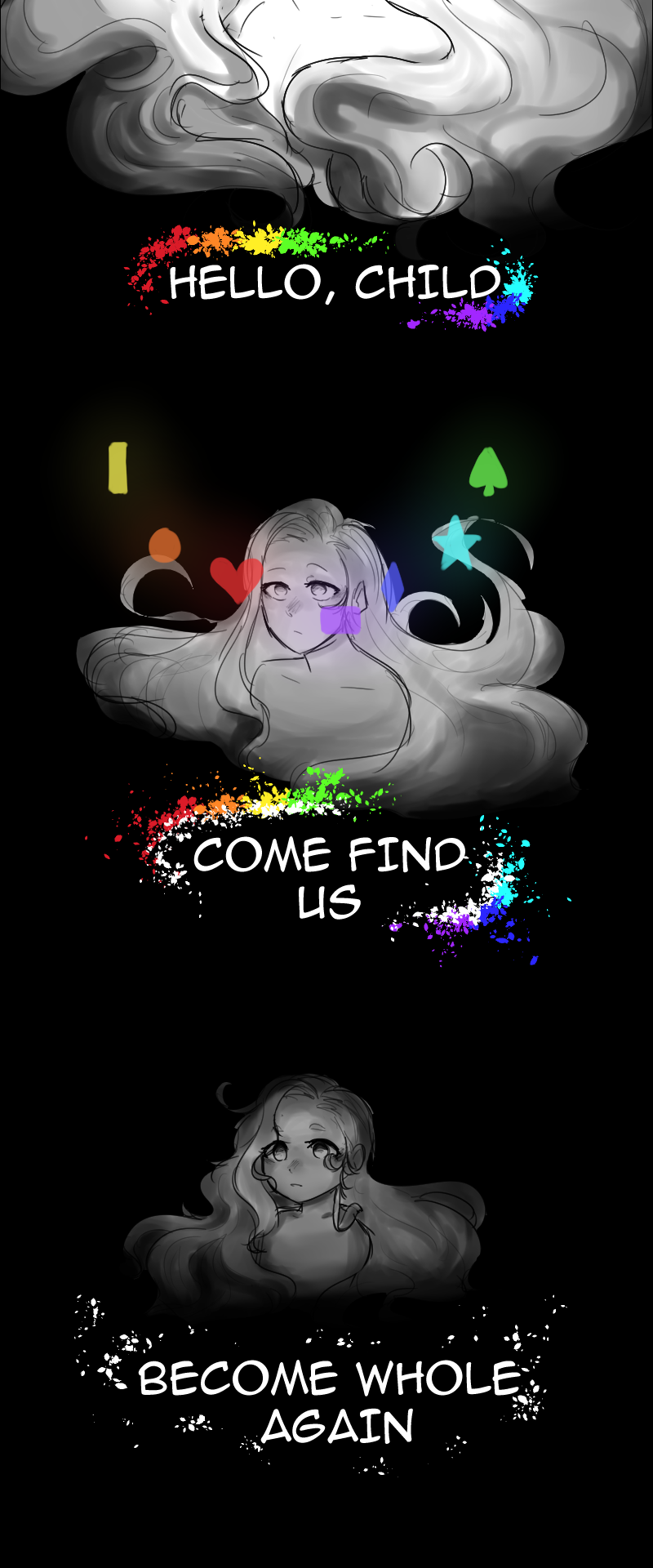 He'll go on adventures to find himself, to find the truth of his origin and where his colors were, perhaps the people he meets will bring pigment to his world.
