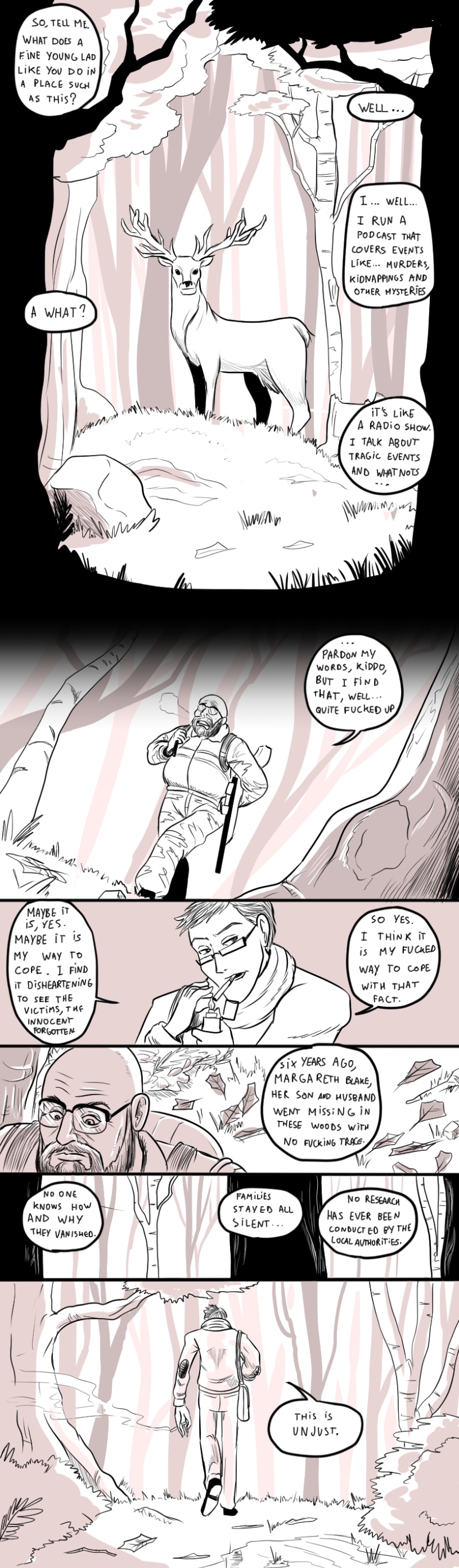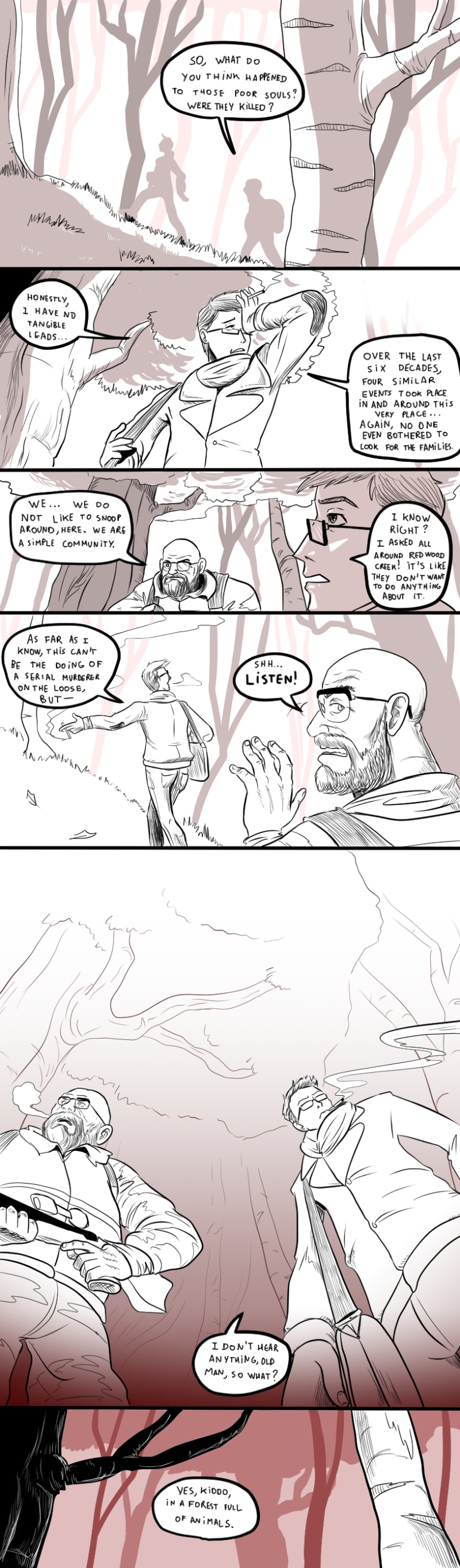 An anthology of comics plunging into the horrors that come in differents forms and colors... Season 1: the Crimson, tells the tale of a small town in northern america, seemingly plagued by various supernatural occurences, but what lies beyond the veil of simple telltale stories might be much more sinister that things let on. Families vanishing in the woods and shadows lurking in the corner of your eye might only be the beginning of the terrible fate that await the people of Redwood Creek.
