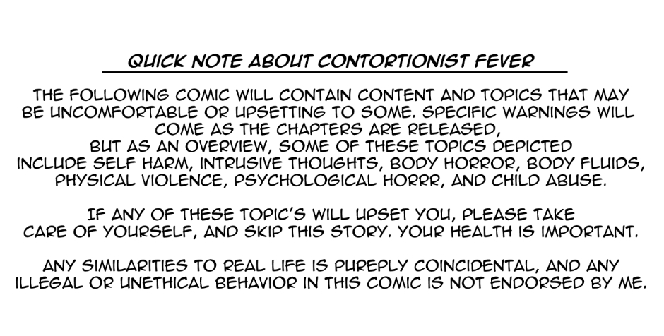 Quick note about Contortionist Fever: The following comic contains content and topics that may be upsetting to some readers. Specific warnings will come as the chapters are released, but as an overview, some of the aforementioned topics include self harm, intrusive thoughts, body horror, body fluids, physical violence, psychological horror, and child abuse. If any of these topics upset you, please take care of yourself and skip this story. Your health is important. Any similarities to real life is purely coincidental, and any illegal or unethical behavior depicted in this comic is not endorsed by me.
