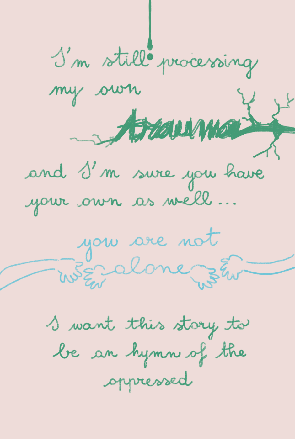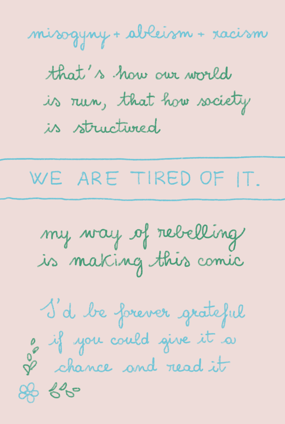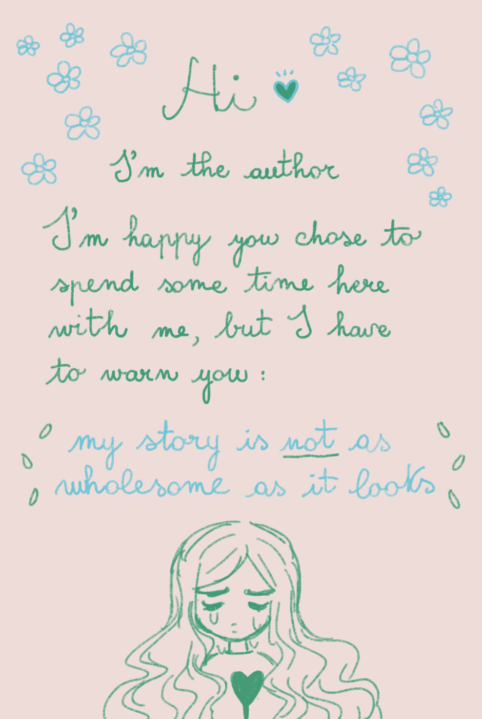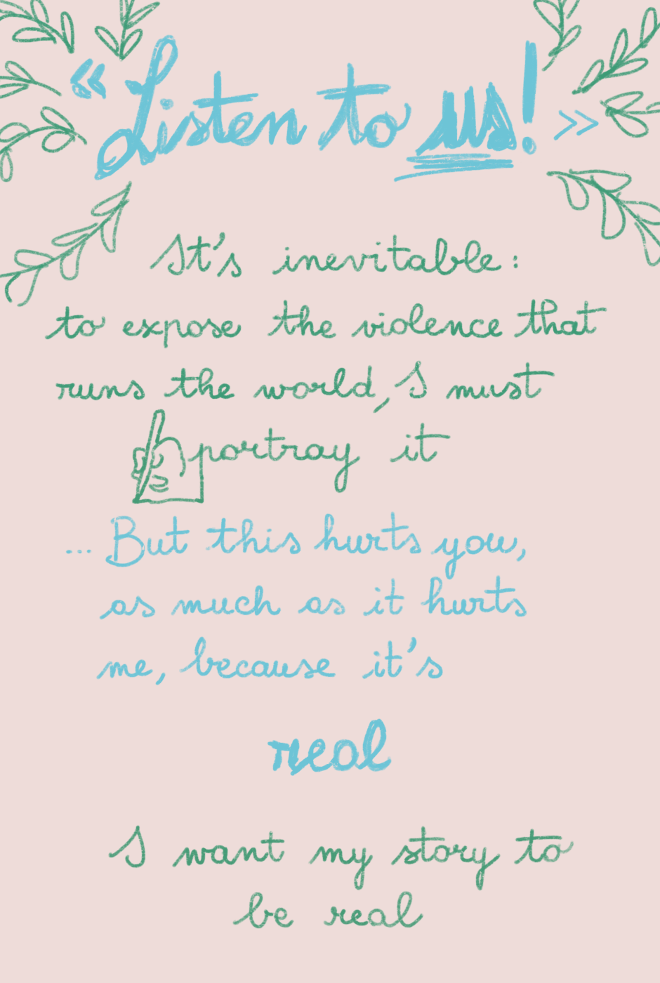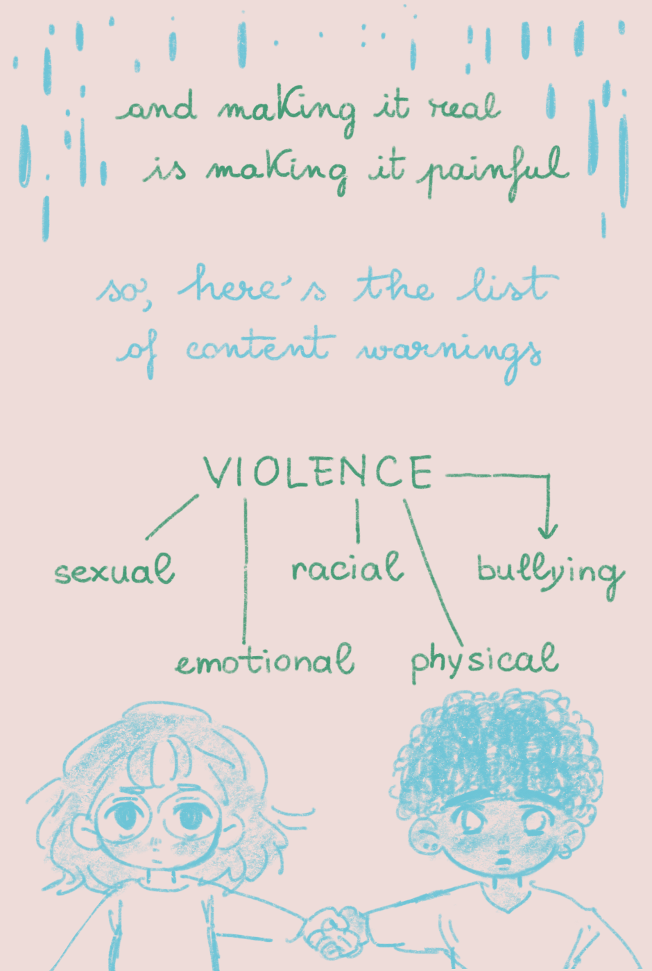 Thank you again. I'd like to add a further disclaimer, a formal one: all of the characters, events and institutions (schools, hospitals, police stations, etc.) are fictional. All of the events are also fictional and do not intend to portray any criminal activity I witnessed in real life. I am a witnesser and victim of the social system of oppression, yet, everything portrayed here is a creation of my own imagination. I portray what happens in real life, based on the systemic nature of the violence I want to denounce, but I am not reporting any real individual.