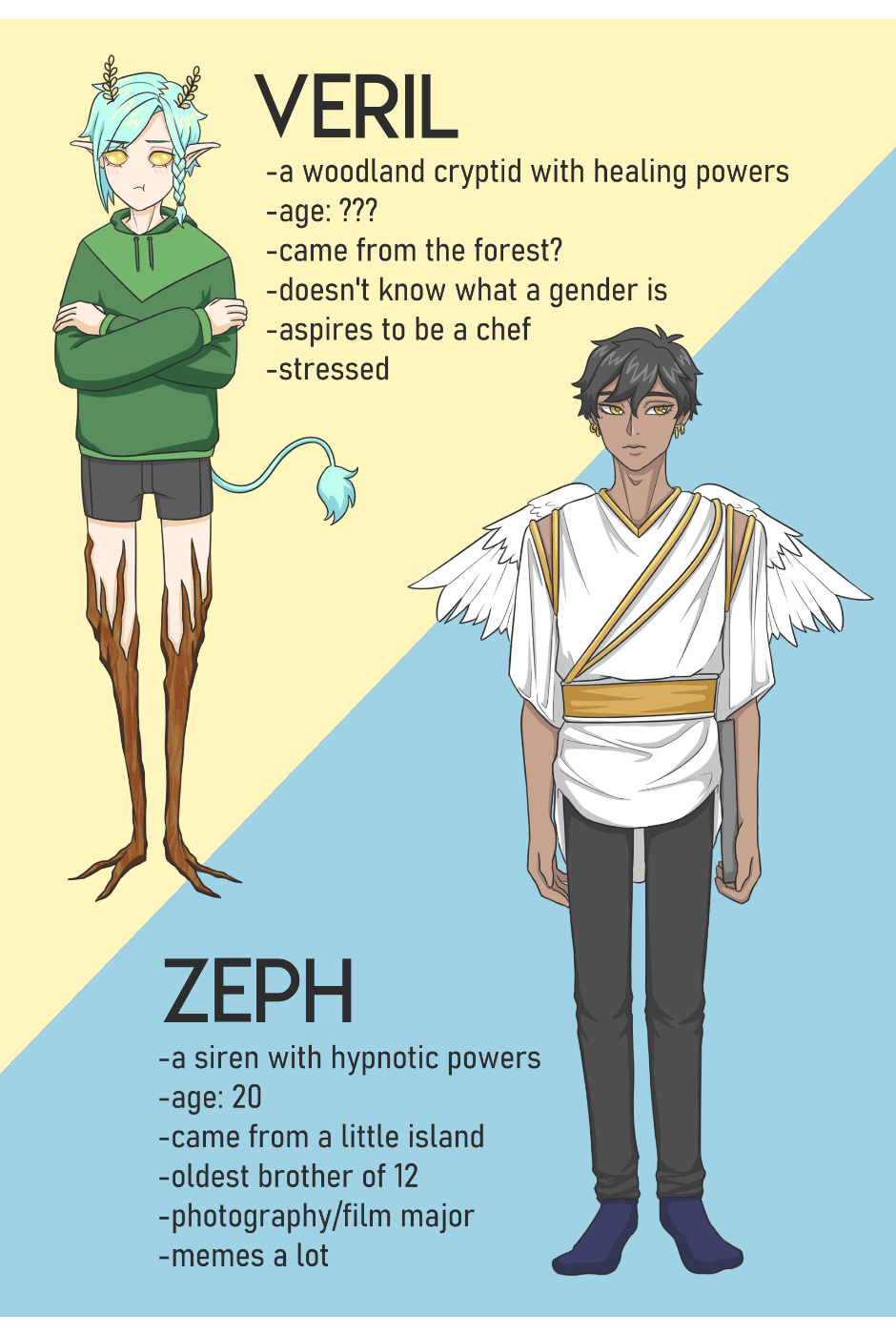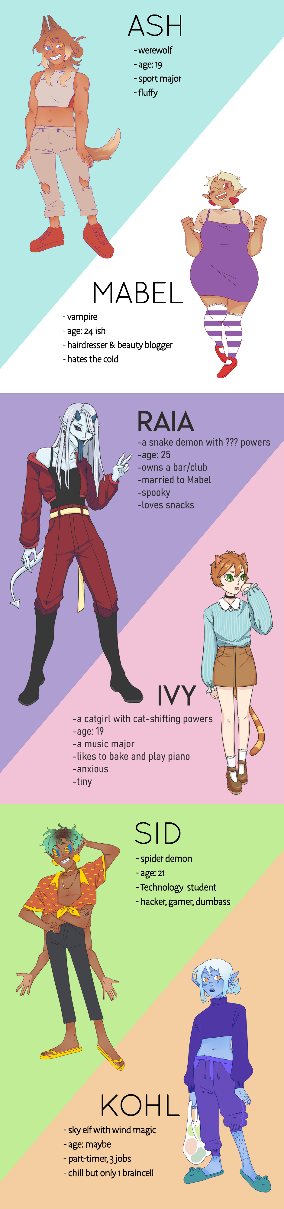 Domestic life of 8 cryptids living together in a mansion! These guys, gals, and non binary pals are out here living their best lives. This is a casual series co-piloted by 2 creators.