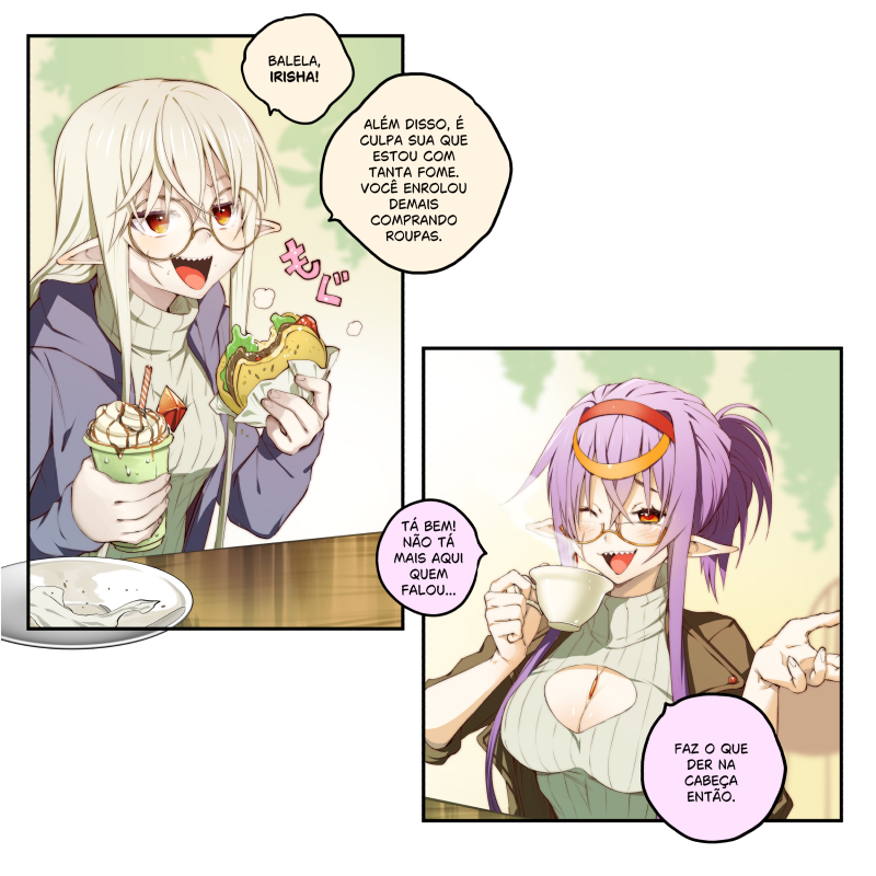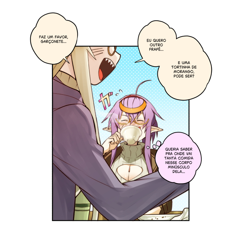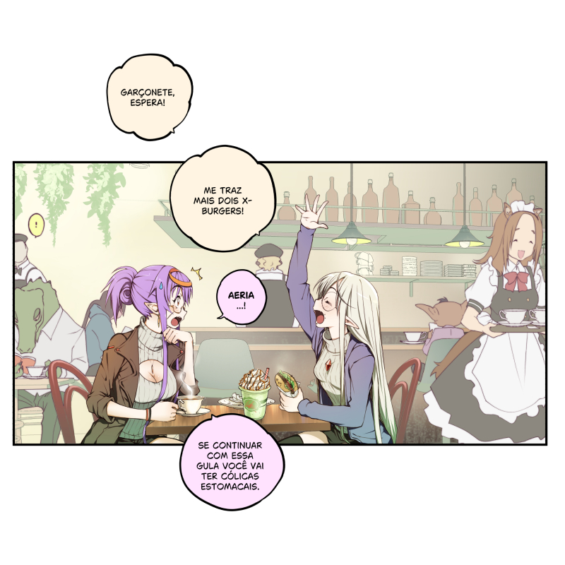 Após um dia de folga, as irmãs elfas estão fazendo um lanche rápido, mas a fome da Aeria parece não ter limites...