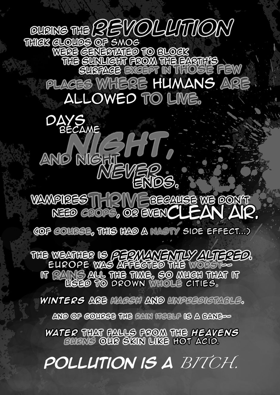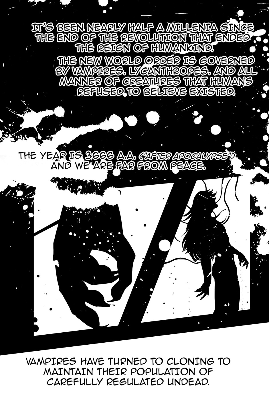 Cyber.Baroque is a post-apocalyptic story set in the year 3666 A.A ("After Apocalypse"). The 'Hordes of Hell' (Vampires, Lycanthropes, and other like-creatures) staged a revolution and won control over the earth. The Council of Six, a governing body of powerful demons, is now responsible for maintaining world order.