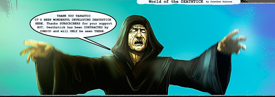 Alberto and I would like to thank everyone at TAPASTIC and all the SUBSCRIBERS for DEATHSTICK. It has been a lot of fun developing our comic here and building our fanbase. This site helped us get noticed and secure a better opportunity for our work. At this time we will leave Tapastic and sign an exclusive contract with COMICO Thailand. http://www.comico.in.th/