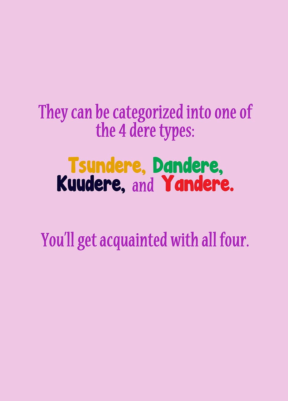 Through the eyes of a protagonist, learn about the 4 "dere" types-- the standoffish Tsundere, the quiet Dandere, the calm Kuudere, and the not-as-sweet-as-they-seem Yandere!