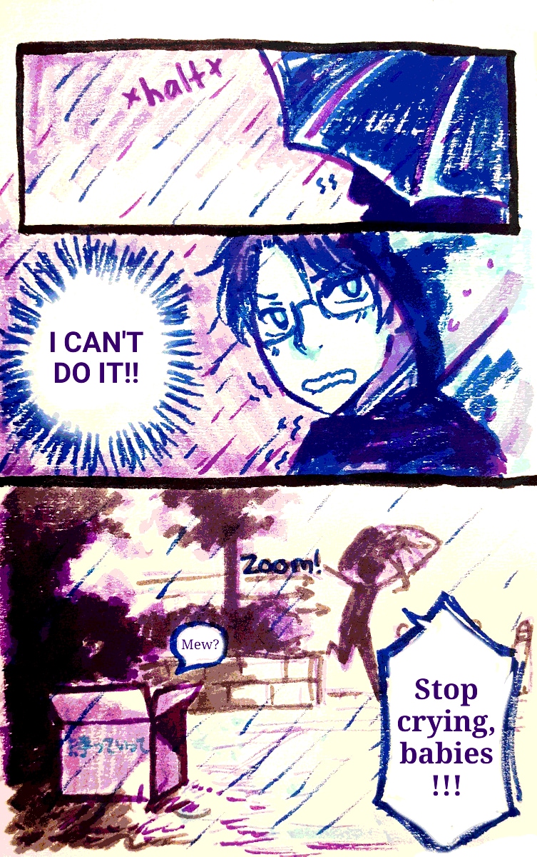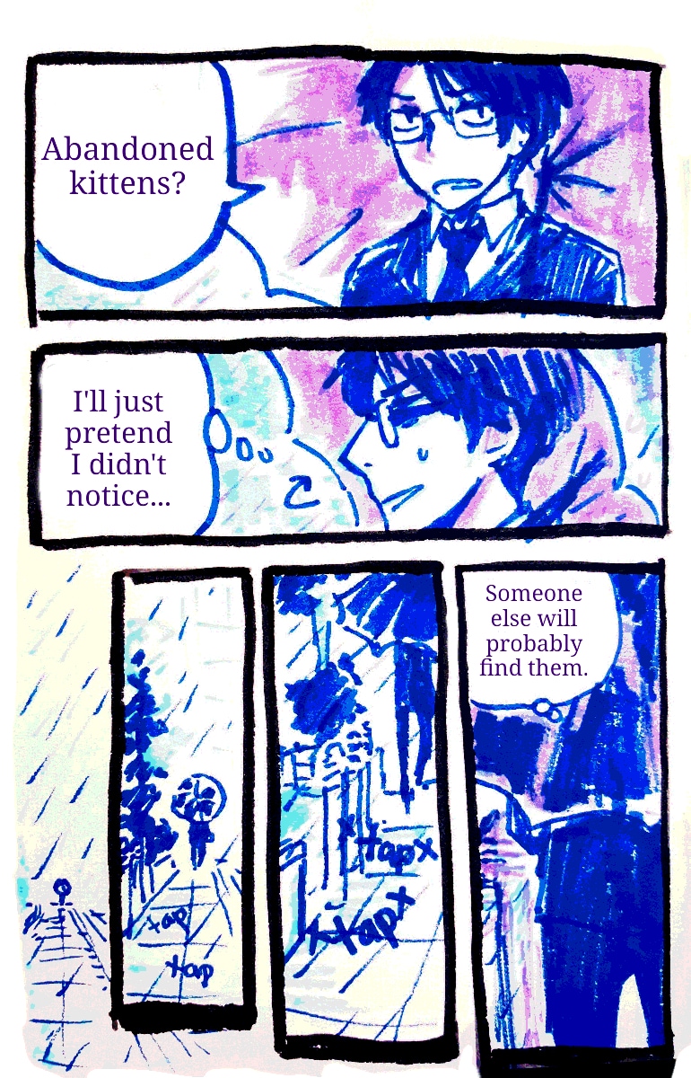 Middle aged Eun finds three abandoned kittens and decides to take them in. But... They aren't ordinary kittens! This comic started in marker with the restriction of no erasing. Now it's digital and erasing is on the table, but no stress allowed and imperfections are welcome. (While there is some romance, this is not BL, sorry)