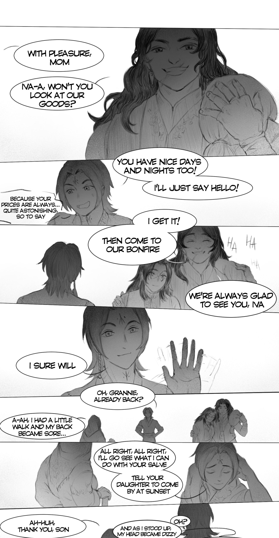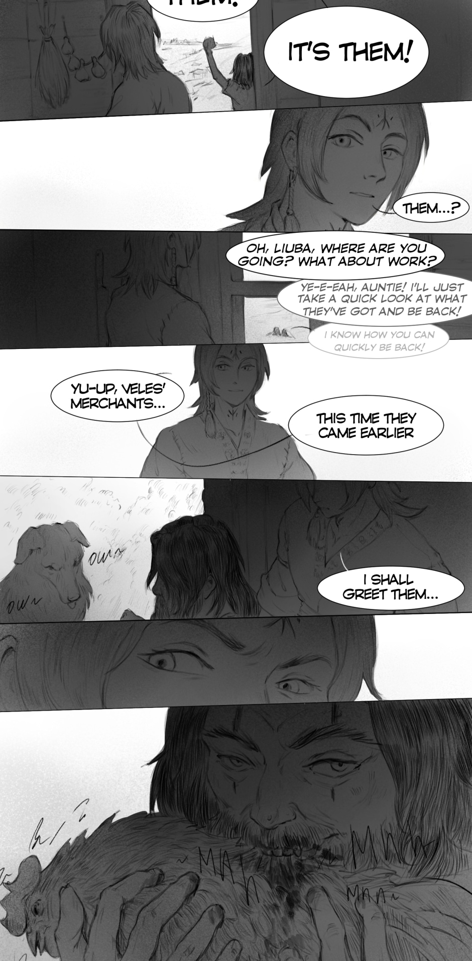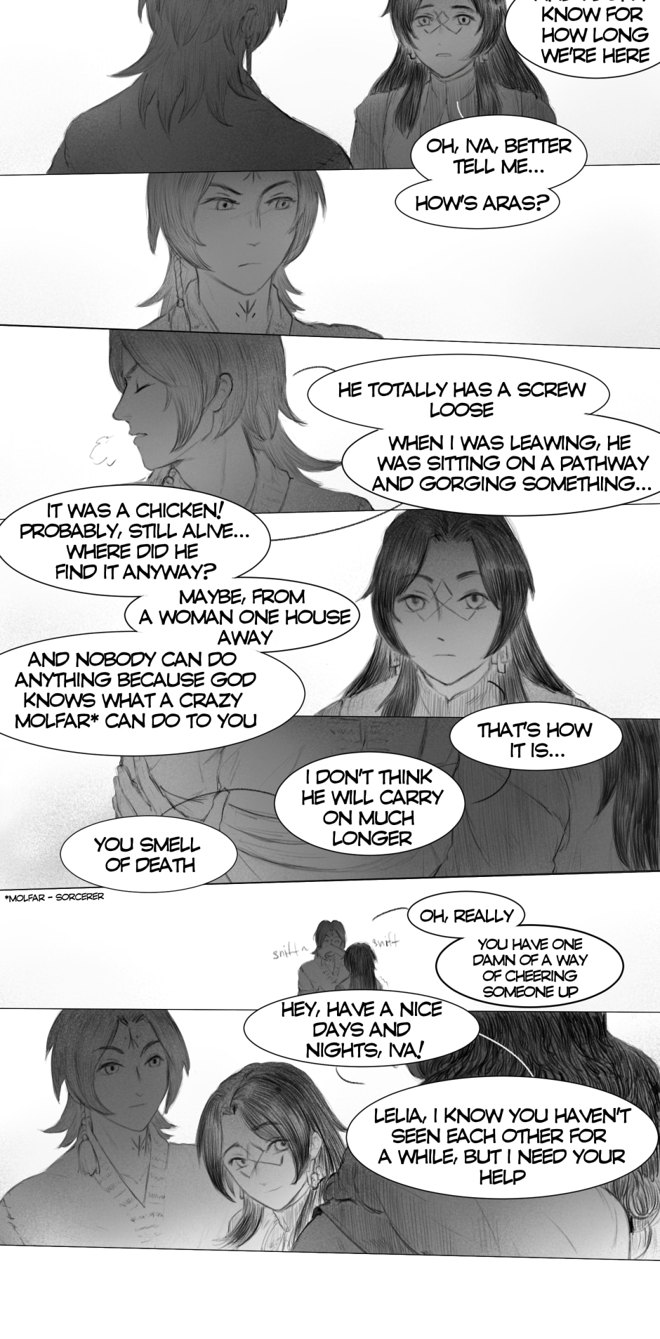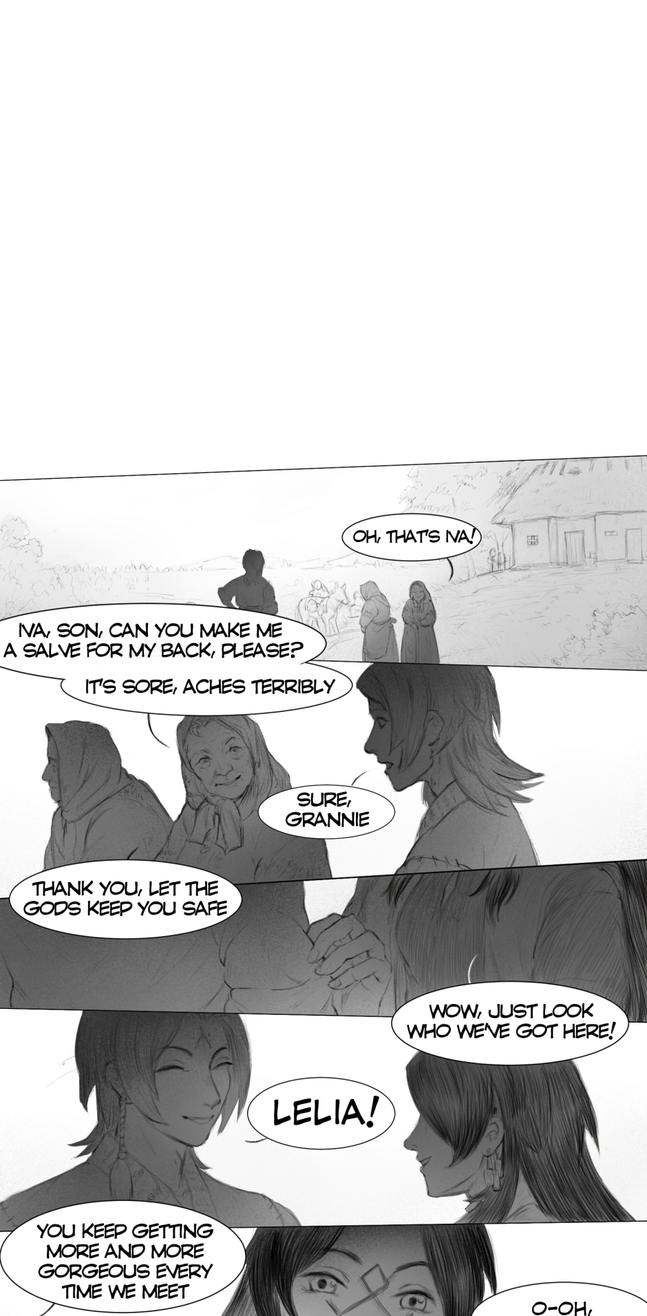 The artwork is very beautiful and detailed. The rough style of the scenes really fits the vibe of the story. The plot at the scuffle between Iva and Aras (I hope I got the names right) was pretty crazy and suspenseful. I was worried Aras was going to kill Iva on the spot, but he didn't, so thank goodness for that. Anyway, great work!
