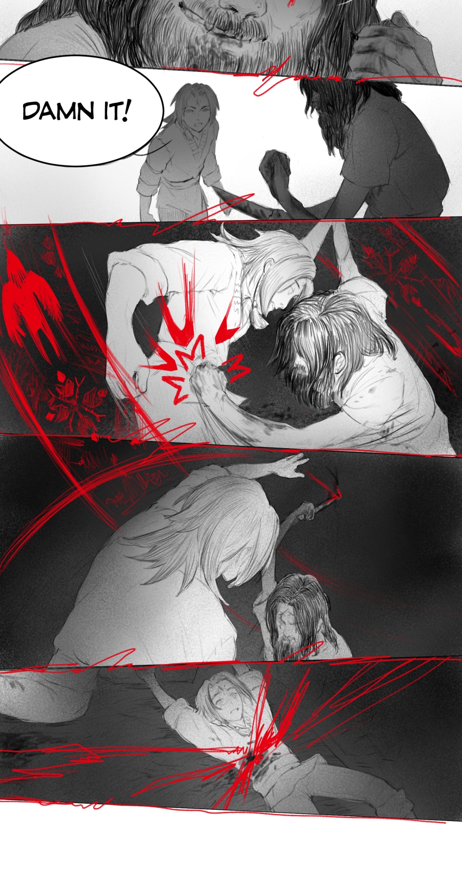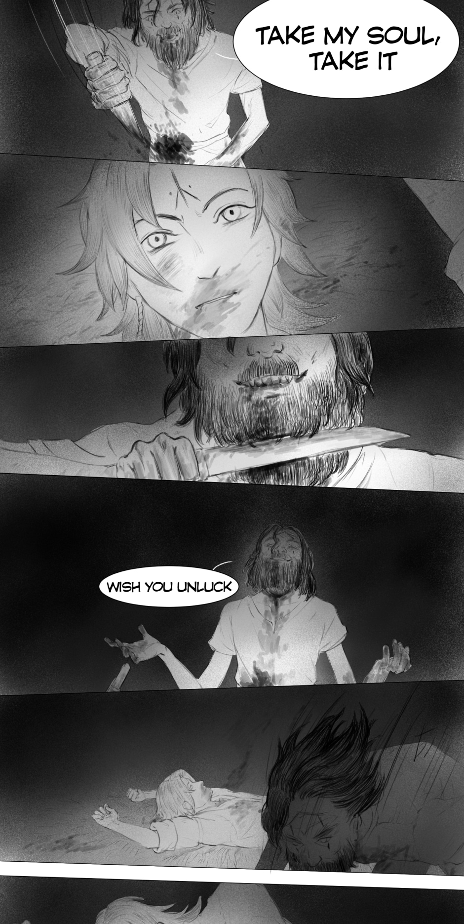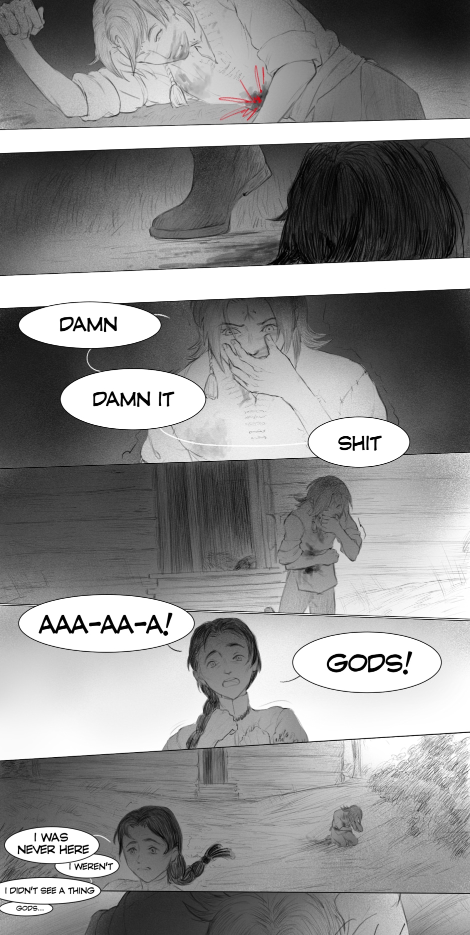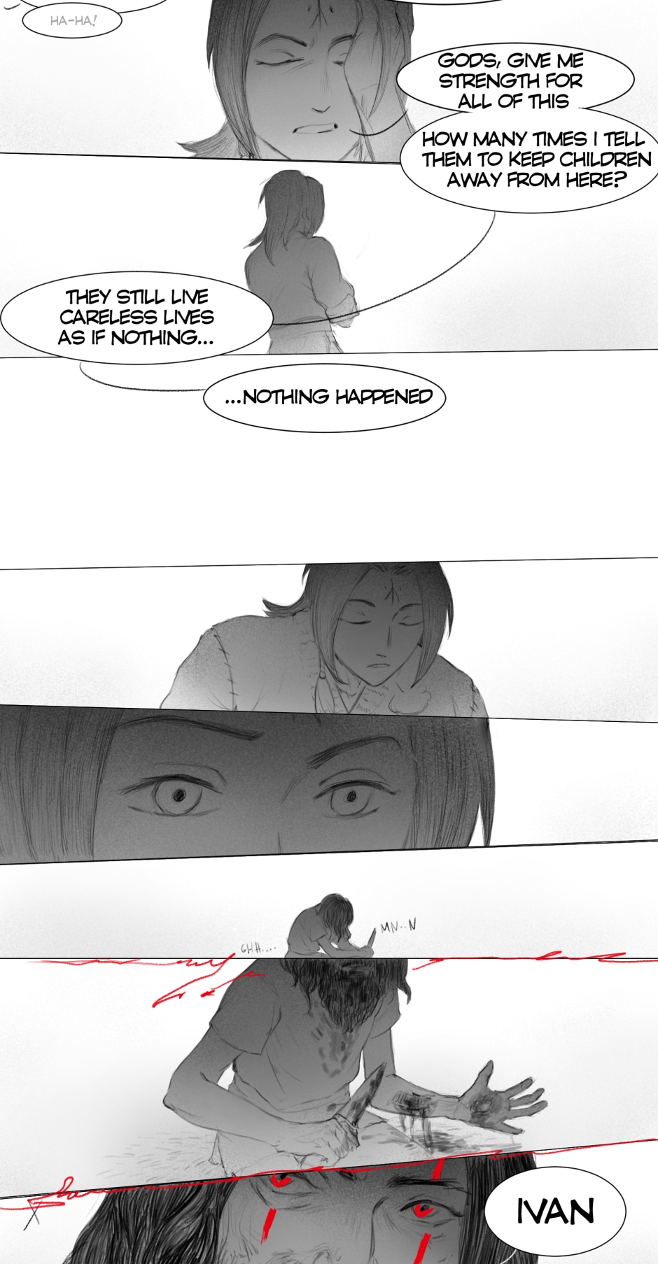 The artwork is very beautiful and detailed. The rough style of the scenes really fits the vibe of the story. The plot at the scuffle between Iva and Aras (I hope I got the names right) was pretty crazy and suspenseful. I was worried Aras was going to kill Iva on the spot, but he didn't, so thank goodness for that. Anyway, great work!