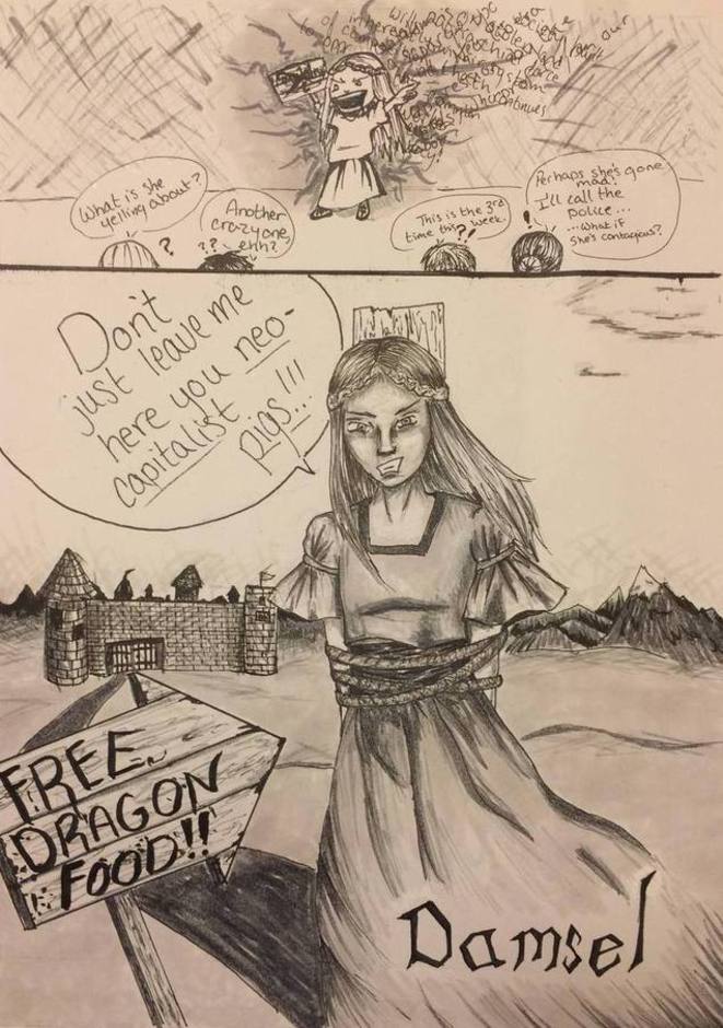 Damsel is a completely hand drawn labor of love based on some of my own experiences as a young student first adopting feminism, witnessing discrimination, testing gender norms, and trying to find my own identity among a sea of labels.