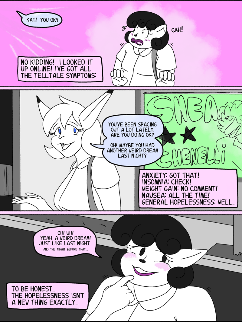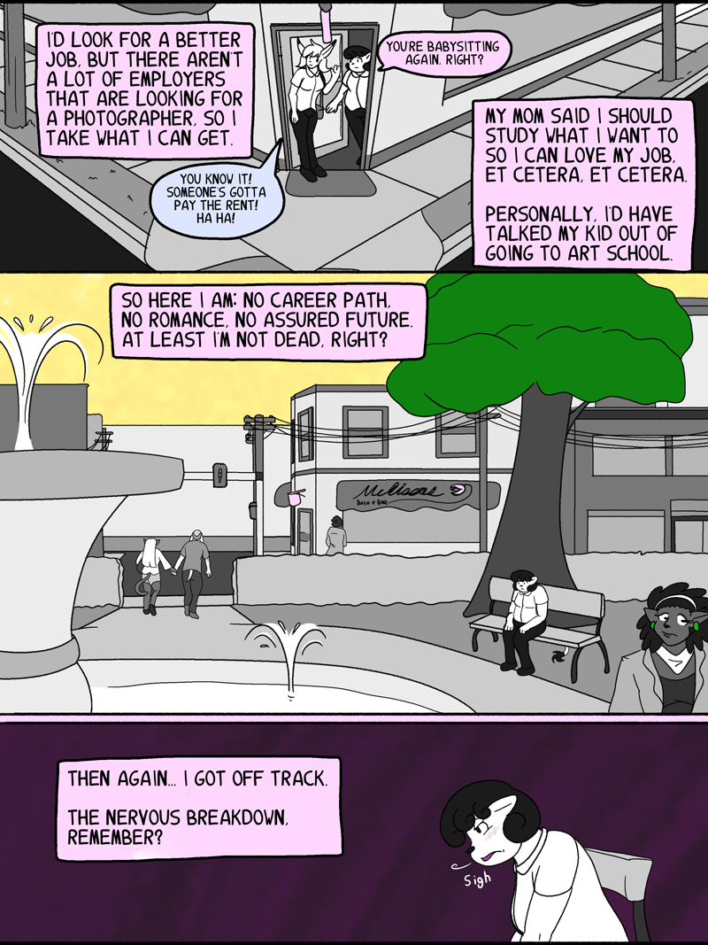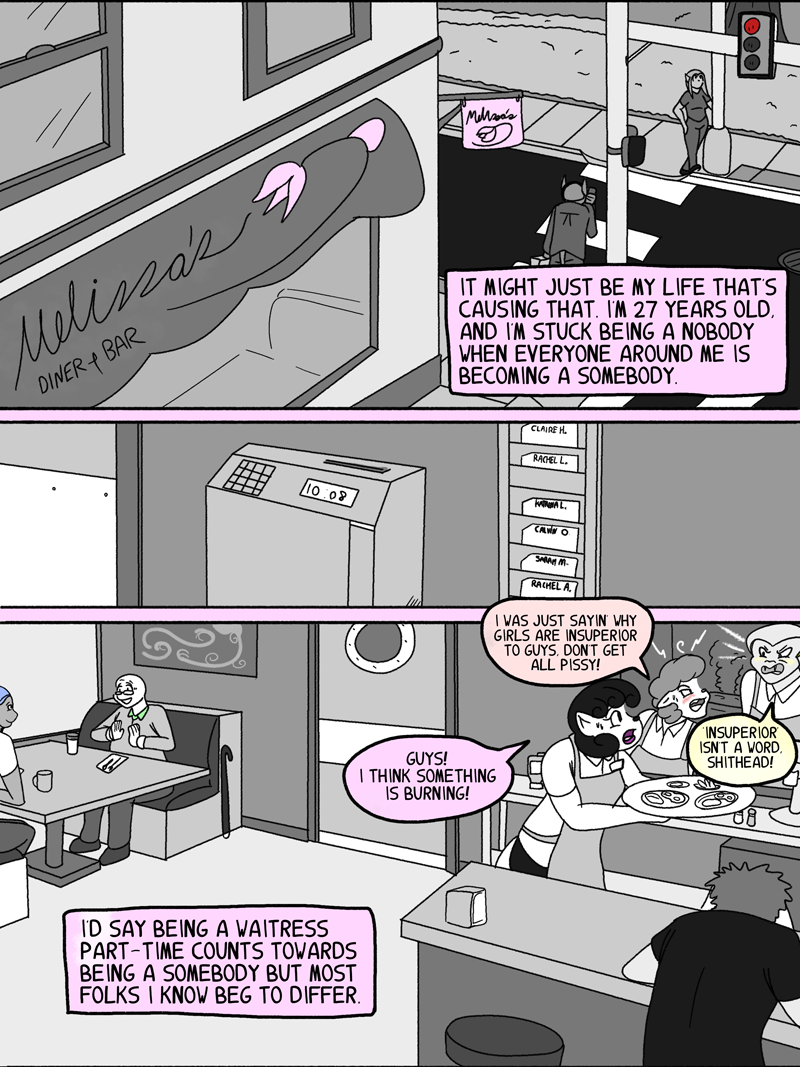Katrina “Kat” Lynn, former photography student and underemployed waitress, makes just enough to get by with her roommate, Rachel. With no prospects for both a better career and a romantic love life, she doesn't have a whole lot going for her! Should her life continue this way, Katrina would remain adrift for years to come, pining for a man who loves someone else, aimlessly wandering the streets of Foefurr, waiting for a purpose. However, a chance meeting with a curious shop run by a curiouser young lady makes a change in the way Katrina sees people around her. Though the cause is uncertain to her, a supernatural force envelops her psyche, allowing her a newfound awareness of the subtle emotions and passions that drive everyone she knows. Unfortunately for her, this manifests in the form of cryptic hallucinations and vaguely prophetic nightmares. Follow her adventures as she seeks the truth of her strange circumstances!