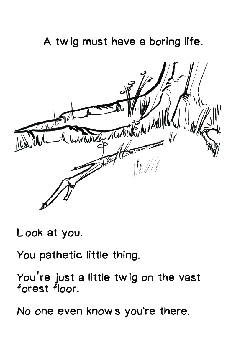 A twig must have the most boring life. You’re always stuck looking in one direction. You can’t move, and everyone has fun around you. If you’re lucky, maybe a dog will pick you up and play with you Or maybe a kid will use you to build a fort. Maybe, just maybe, the universe hasn’t decided what it wants to do with you. Maybe you’ll be used for a fire that helps warm up a freezing child or maybe you’ll be used as a part of someone’s evil agenda. Does it really matter? You’re finally being used for something. In Twig, you’ll follow the life of a simple, unused twig.