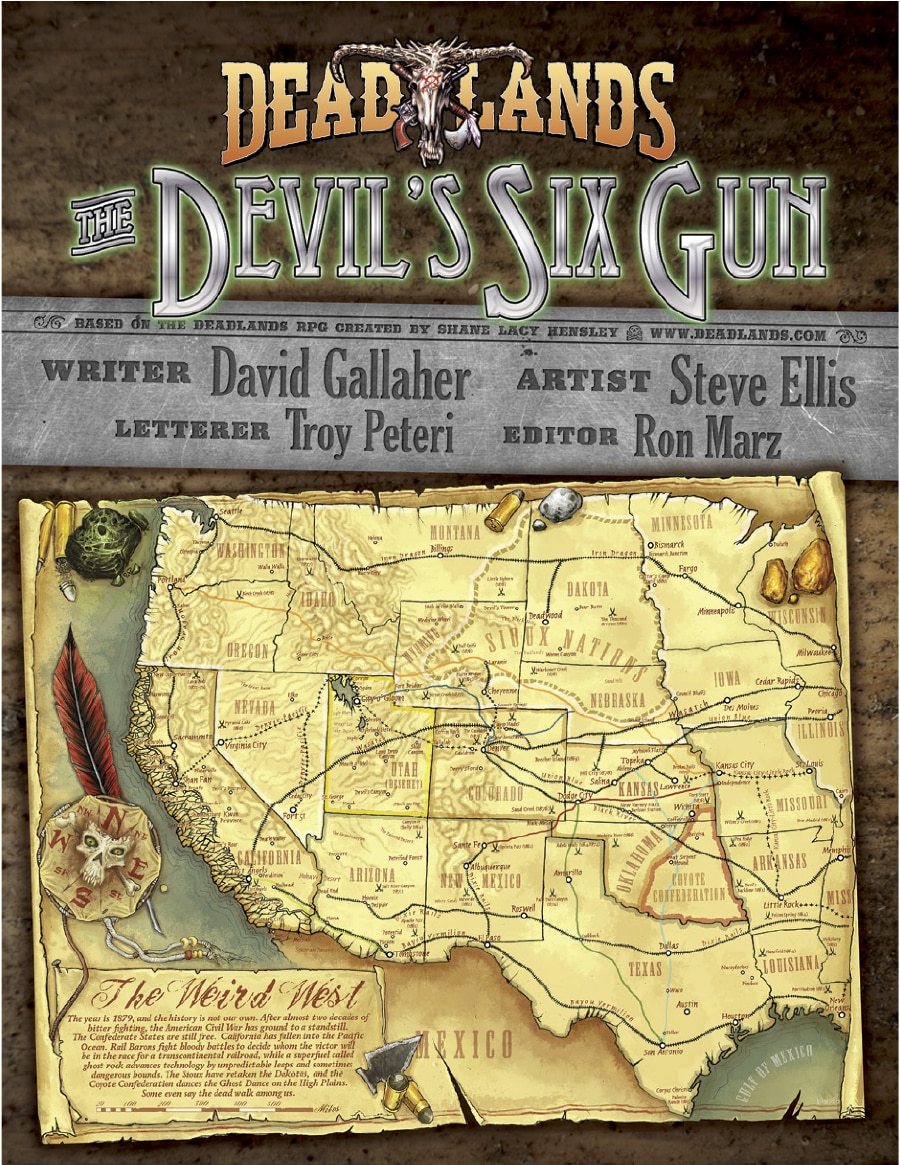 Based on the game DEADLANDS from Pinnacle Entertainment! Visionary Comics and Pinnacle Entertainment present the first of four one-shots by industry superstars, bringing the weird Western world of DEADLANDS to comics! In this issue: The Havey Award-winning HIGH MOON team of DAVID GALLAHER & STEVE ELLIS tell the story of inventor Copernicus Blackburne, who risks even his immortal soul in his Faustian quest to build 'The Devil's Six-Gun!'