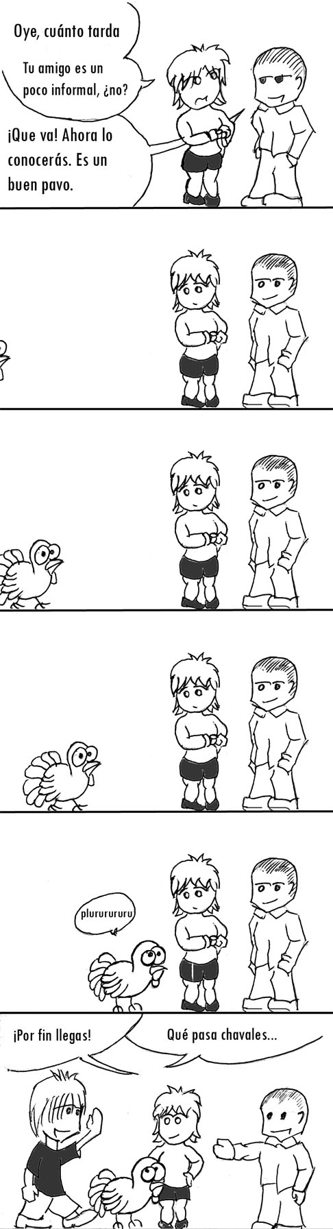 La primera tira es cutre con ganas. Creo que utilicé lápiz y rotring, aunque por lo menos tenía Phososhop, el cual usé para forzar la saturación y el contraste. Os doy mi palabra de que el nivel mejora a partir de aquí.