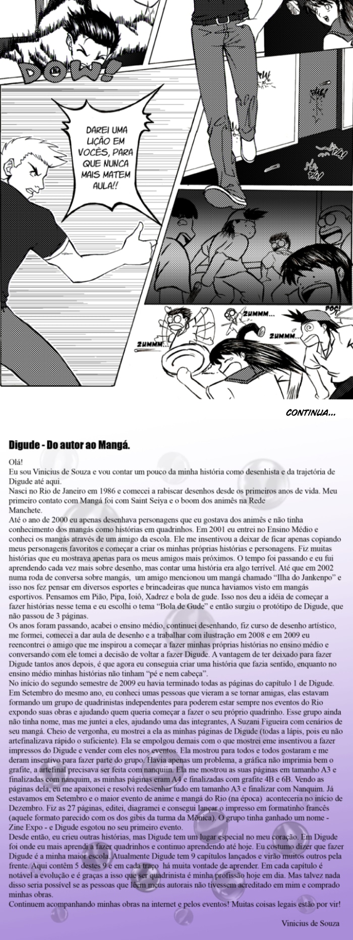 Digude foi lançado em 2009, meu primeiro manga independente publicado. Hoje eu vivo de quadrinhos, trabalhando para editoras internacionais, mas tenho um carinho enorme por essa obra, pois sem ela, minha carreira na área não existiria. Mesmo sendo um traço meu de 12 anos atrás nos primeiros capítulos, tenho certeza que a história vai lhes divertir demais.
