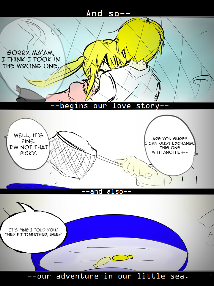 This story is about a group of fishes (which have been changed to human for this manga by the author) that lives in an aquarium in this one human's house. Even in that small aquarium, or called as a small sea, a great adventure had been unfold by this school of fishes!