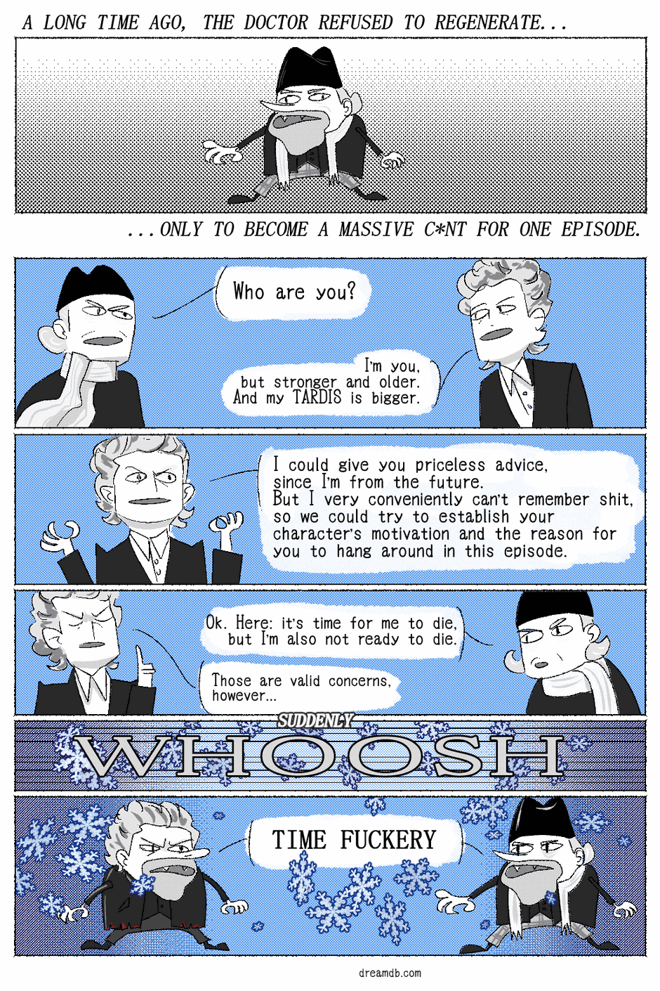 I started drawing parody fan fiction a few years ago because I loved Peter Capaldi's Doctor but hated Moffat's writing. I started with s08e01, but I haven't finished that one yet (oops), so here's the most recent stuff.
