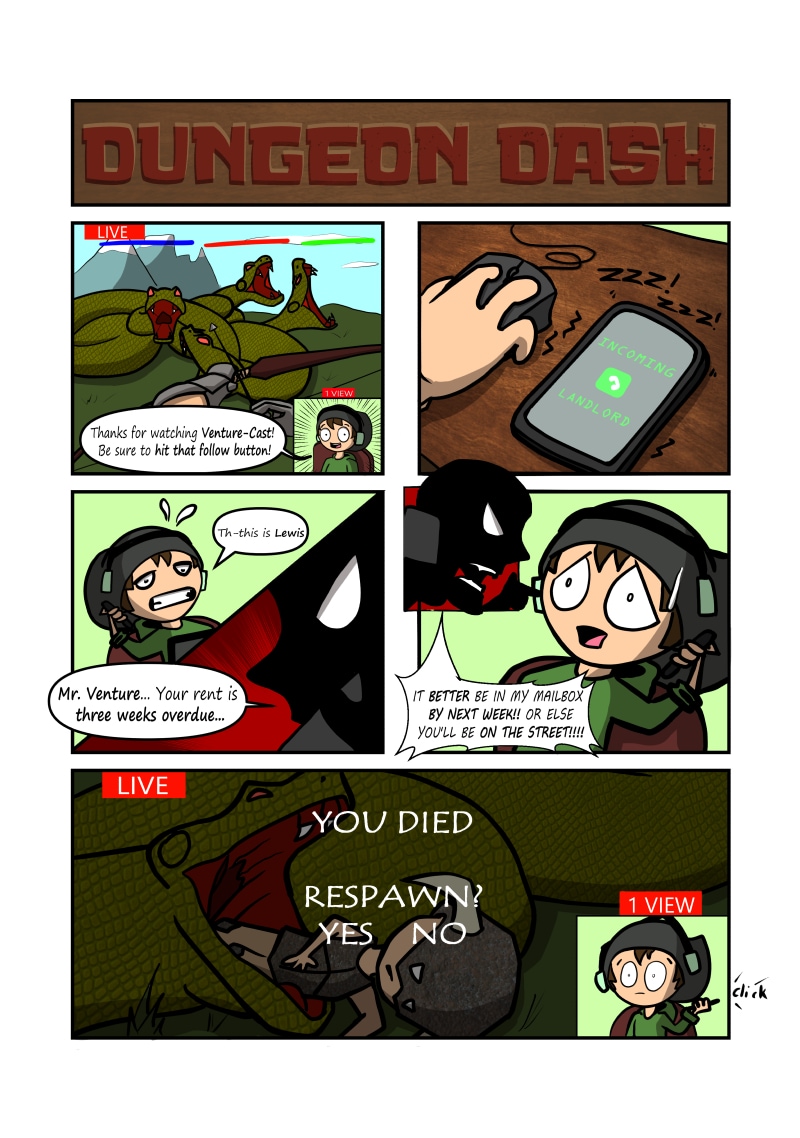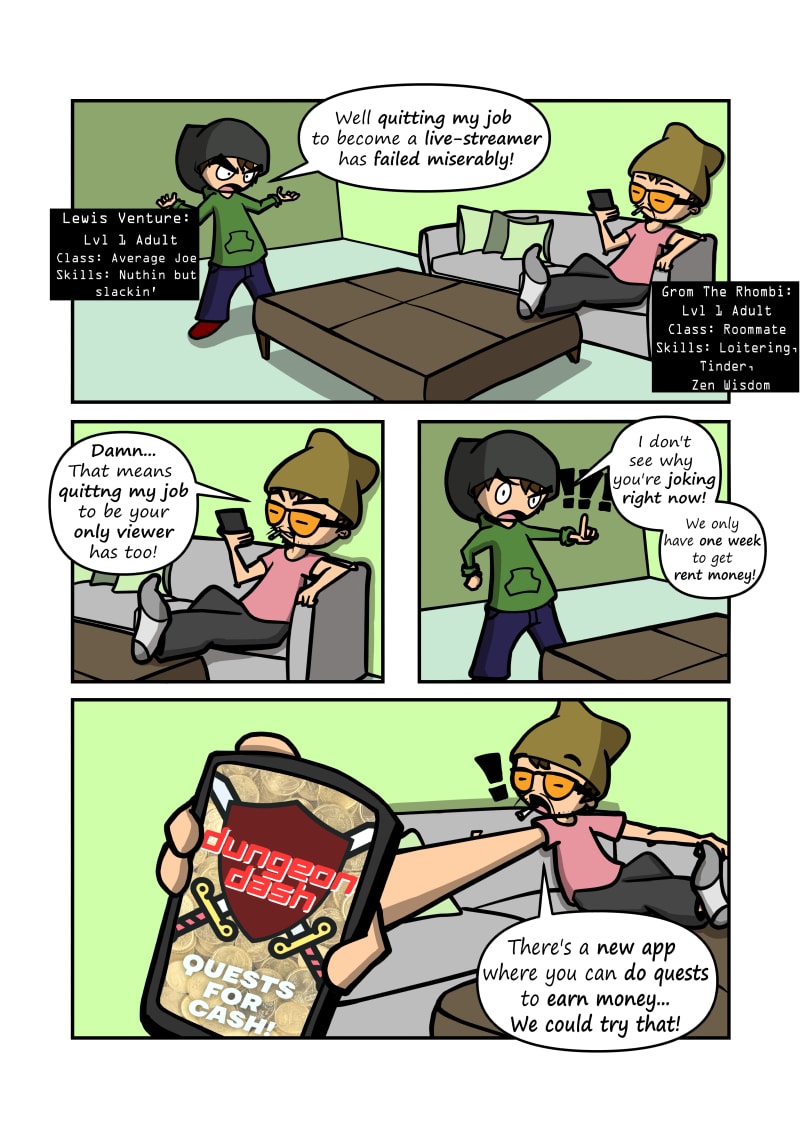 Grom and Lewis try to scramble their overdue rent money by the end of the week as they go on Dungeon Dashes to earn money. Along the way they face the perils of low-level RPG quests in their area.