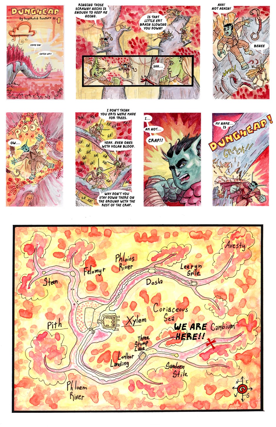 Follow the adventures of Dungheap, a kid from two opposing races, the Volans and the Erts, living on top of a magical tree, being chased by powerful creatures that haven't been seen in over a hundred years. You can learn more at my Patreon. Link is above.