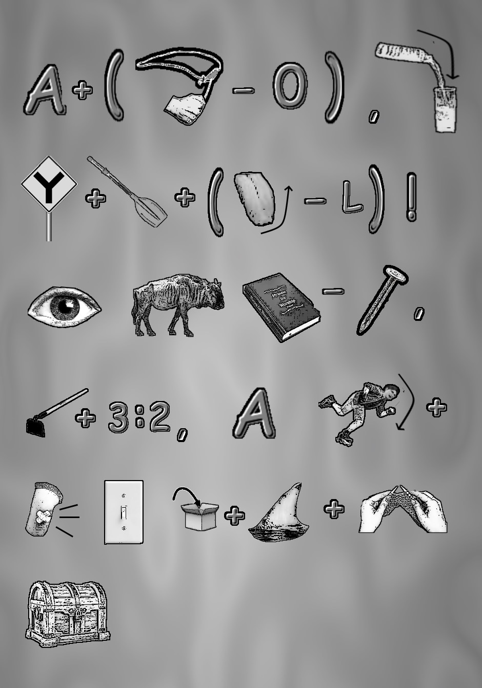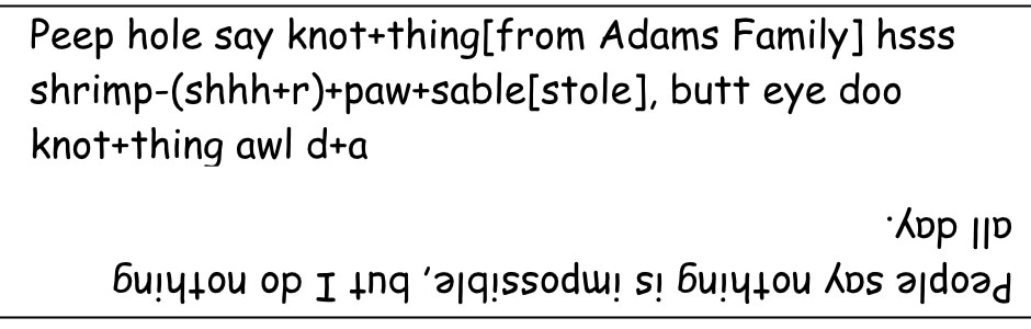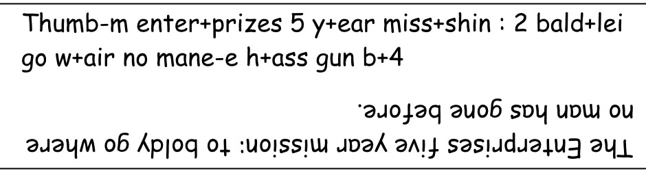 Try to guess the common phrases, quotes, aphorisms, proverbs or other saying from the clues. These may be literal, synonyms, imperfect rhymes, or bad puns (you are forewarned. The answer key will precede the next day's puzzle. Here are the first five to get you started, enjoy.