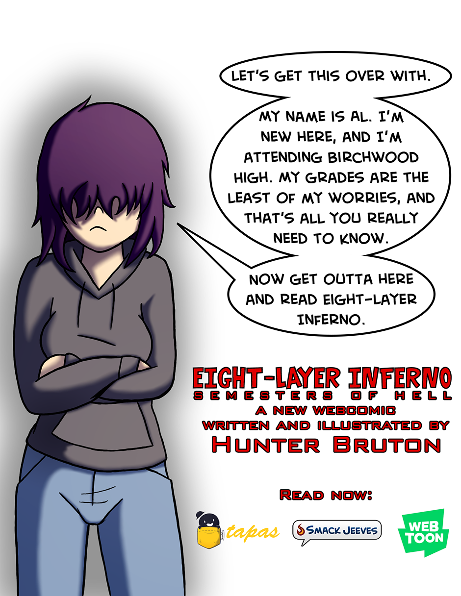Welcome, new and old readers, to the first (kind of) page for my new webcomic, Eight-Layer Inferno: Semesters of Hell! This is just a little preview image, and probably one of the very rare moments you will ever see one of my characters breaking the fourth wall.