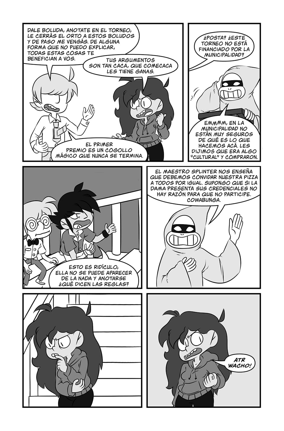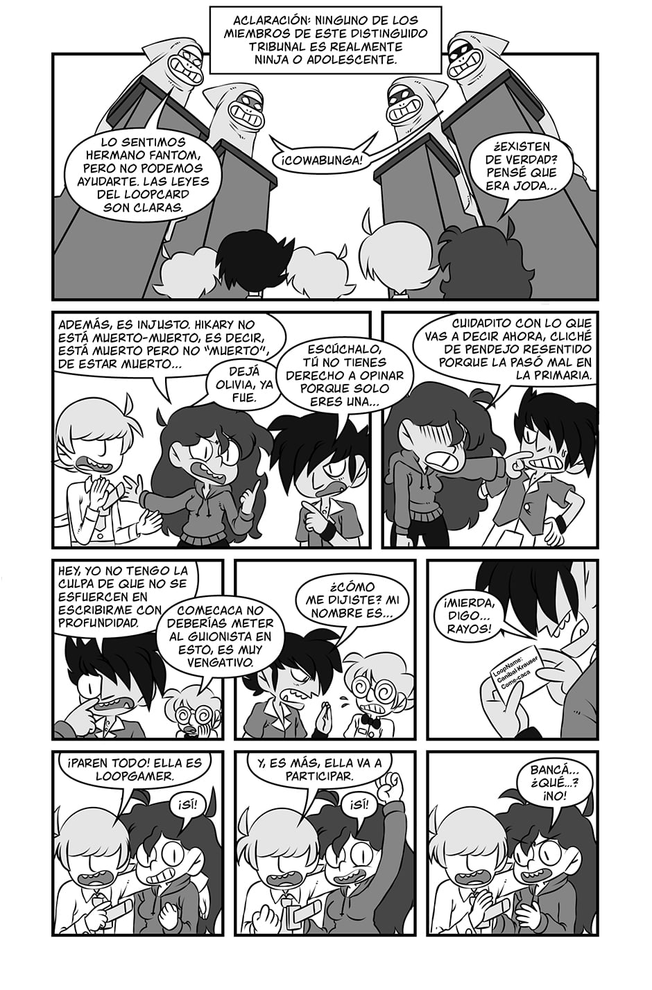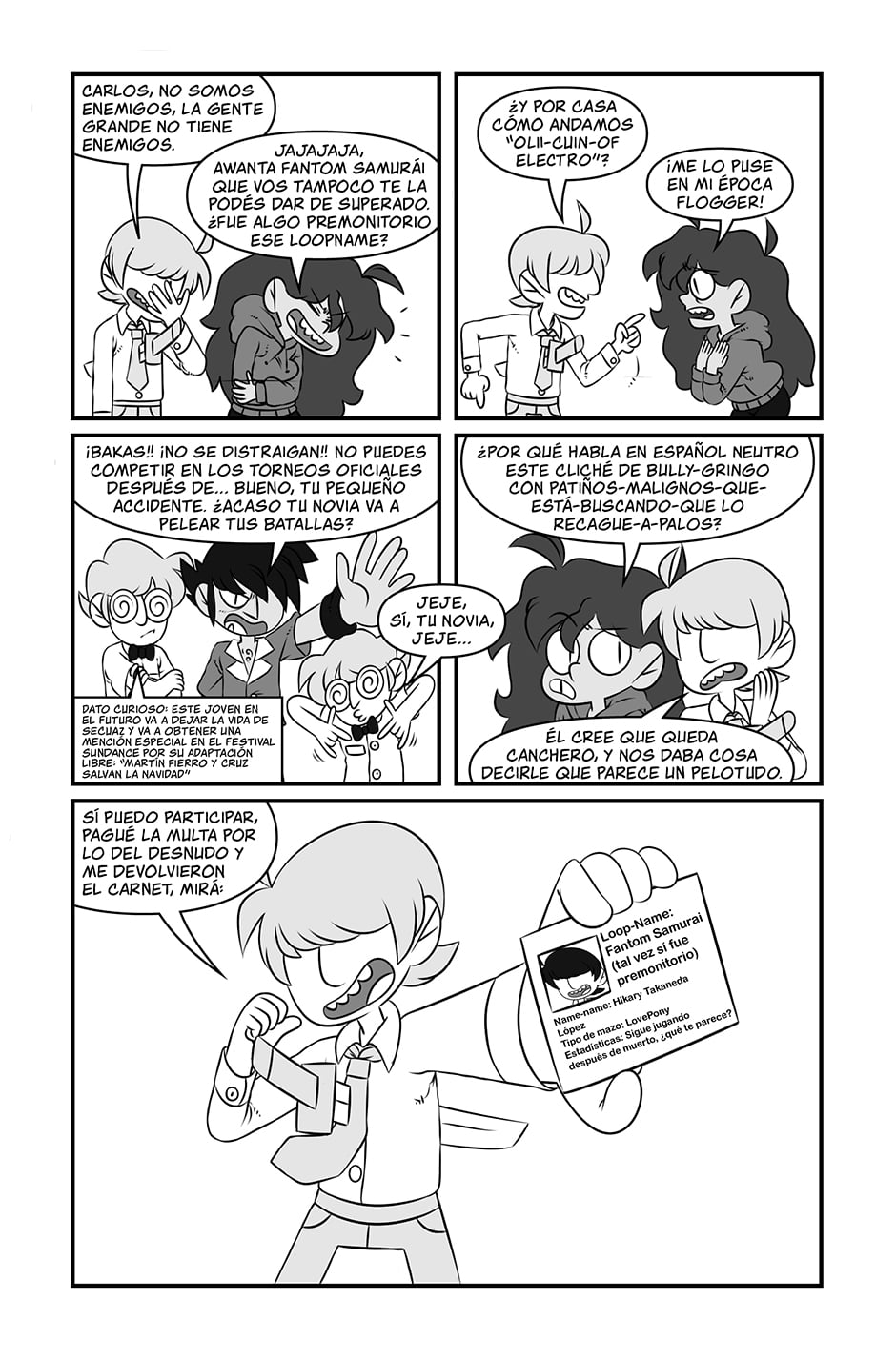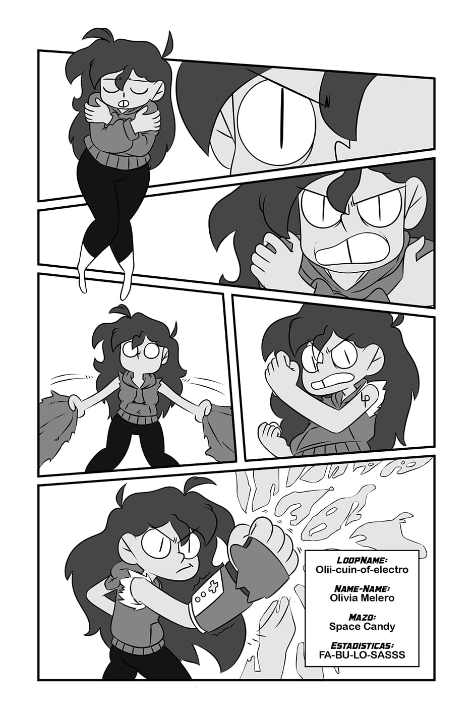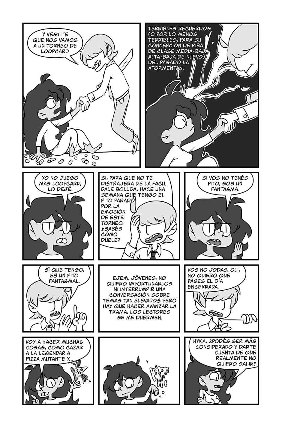 Olivia Melero : Oli es una piba como vos, pero más petisa. Después de que su plan de vida meticulosamente planeado se fuera al carajo, decide mandar todo a la mierda e intentar volverse jugadora profesional de Loopcard. Un juego de cartas coleccionables para nerds, drogones y nerds drogones.