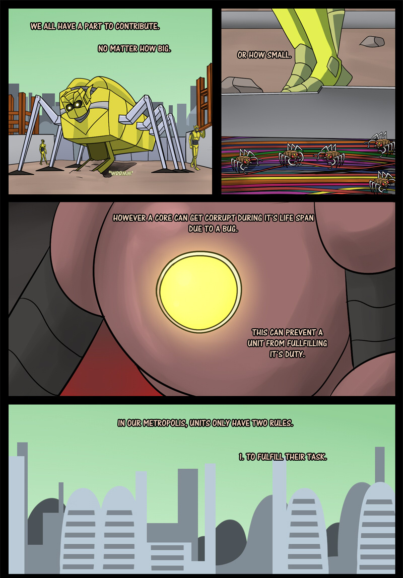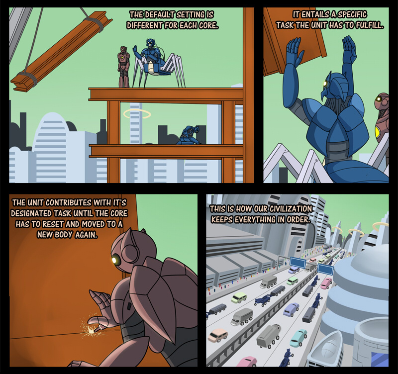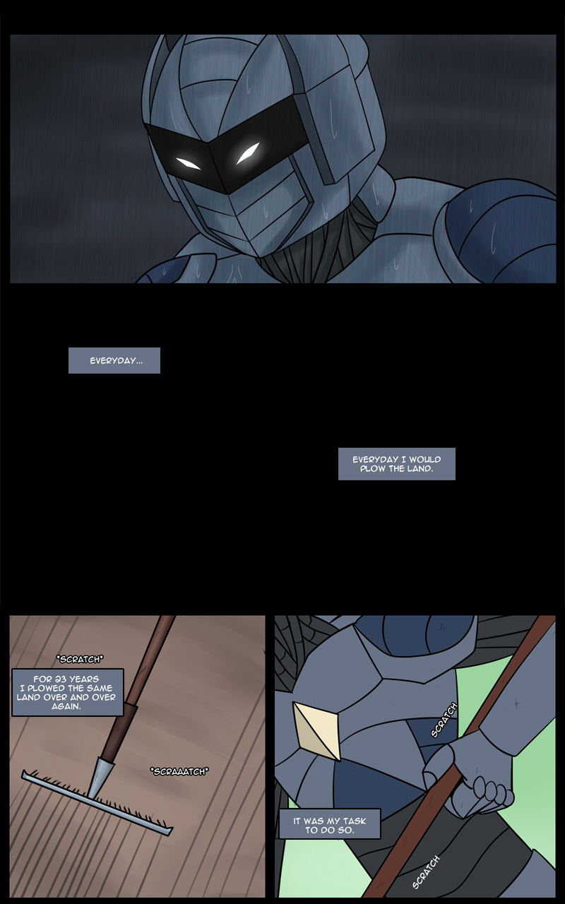 A planet only habited by Robots. Each Robot has their role to contribute in this perfect functioning society. Or so it seems. The story's main Robot's job is to harvest crops. However no matter how many years it spends on growing crops, the planet is simply not fertile enough. One day realizing the tasks it's assigned to is futile, it stops. Leading to severe consequences.