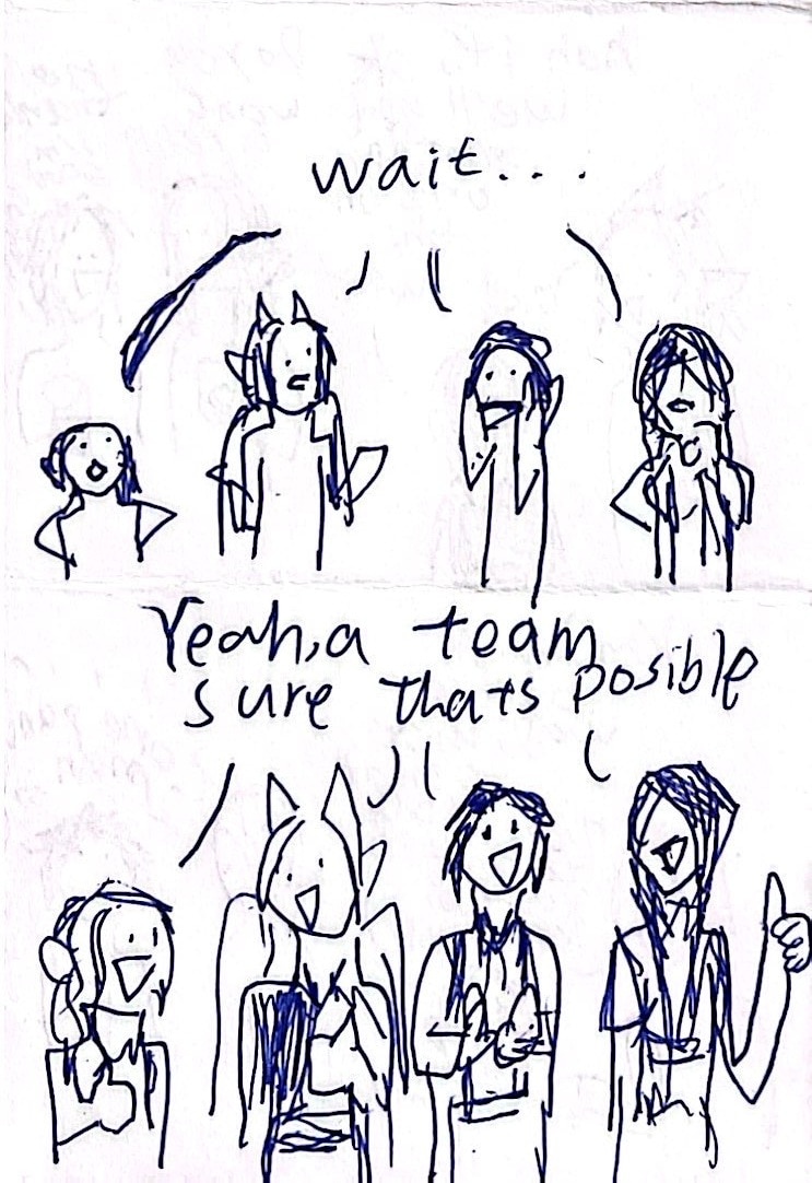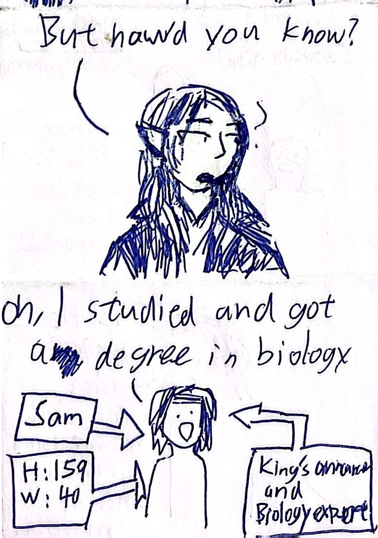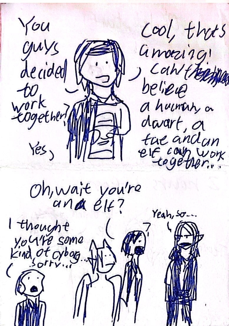 He met Maethran (elf), Naville (dragon faerie), and Javier (dwarf). And later on they became a team to win the contest and basically try to survive in this world.