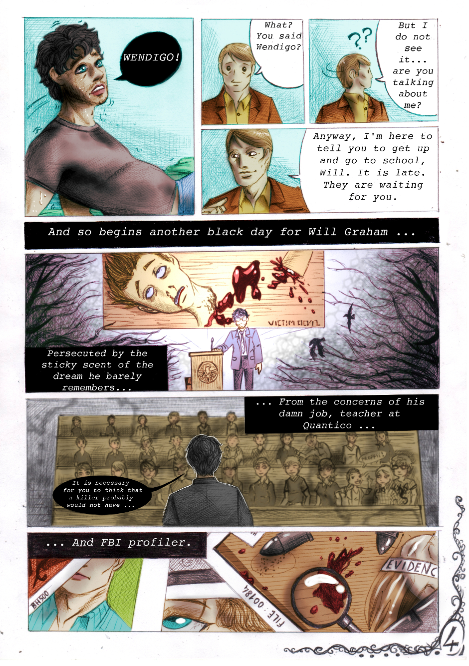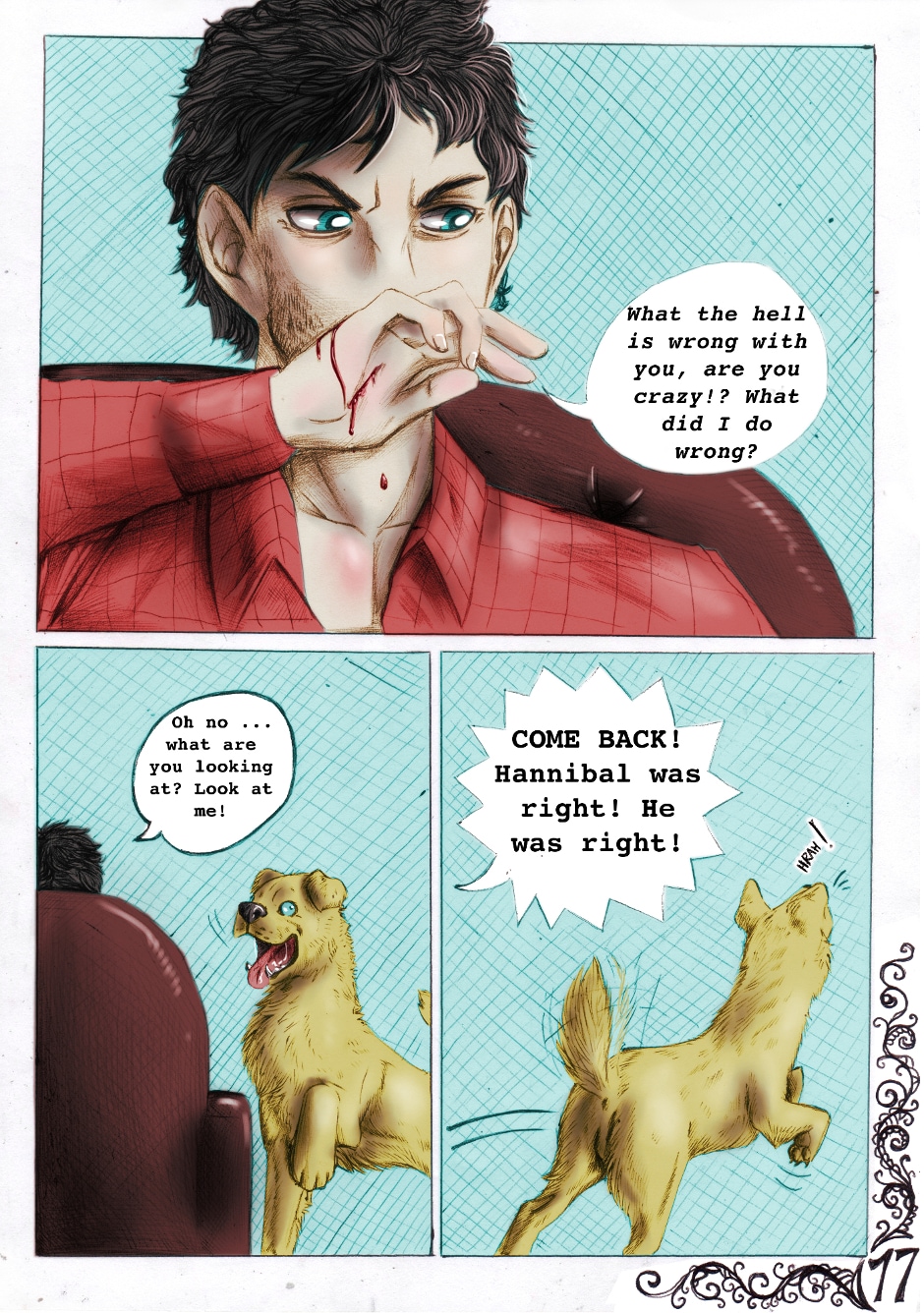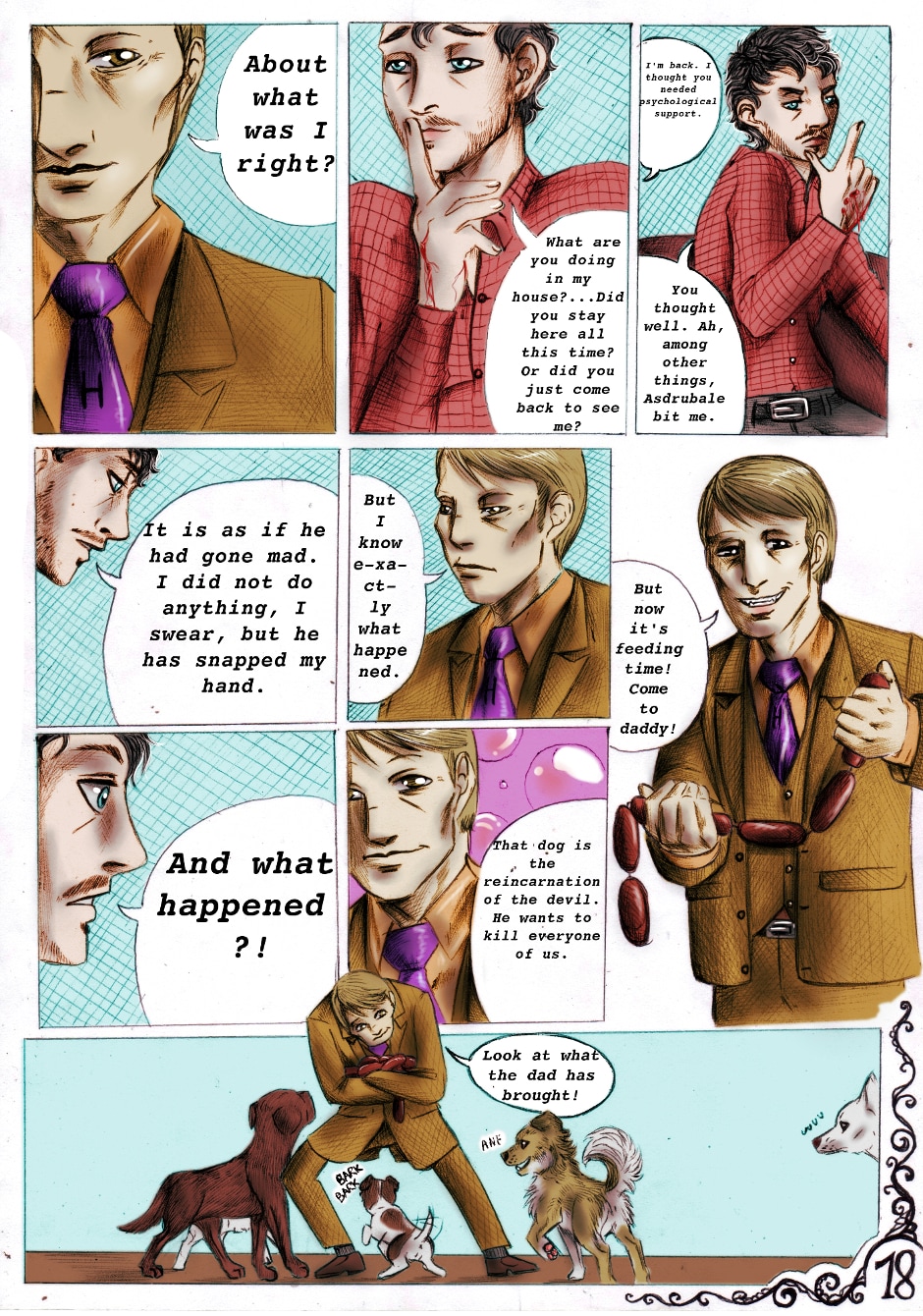And so starts this new comic series. Here we know Will and Hannibal, main characters of (at least) the first part of the series. And we meet also this "adorable" dog, Asdrubale... Who (or what) is Asdrubale in reality? What means Will's dream? Who is the killer willing to murder an innocent man just for a book? Follow Exoterism and you will discover it!
