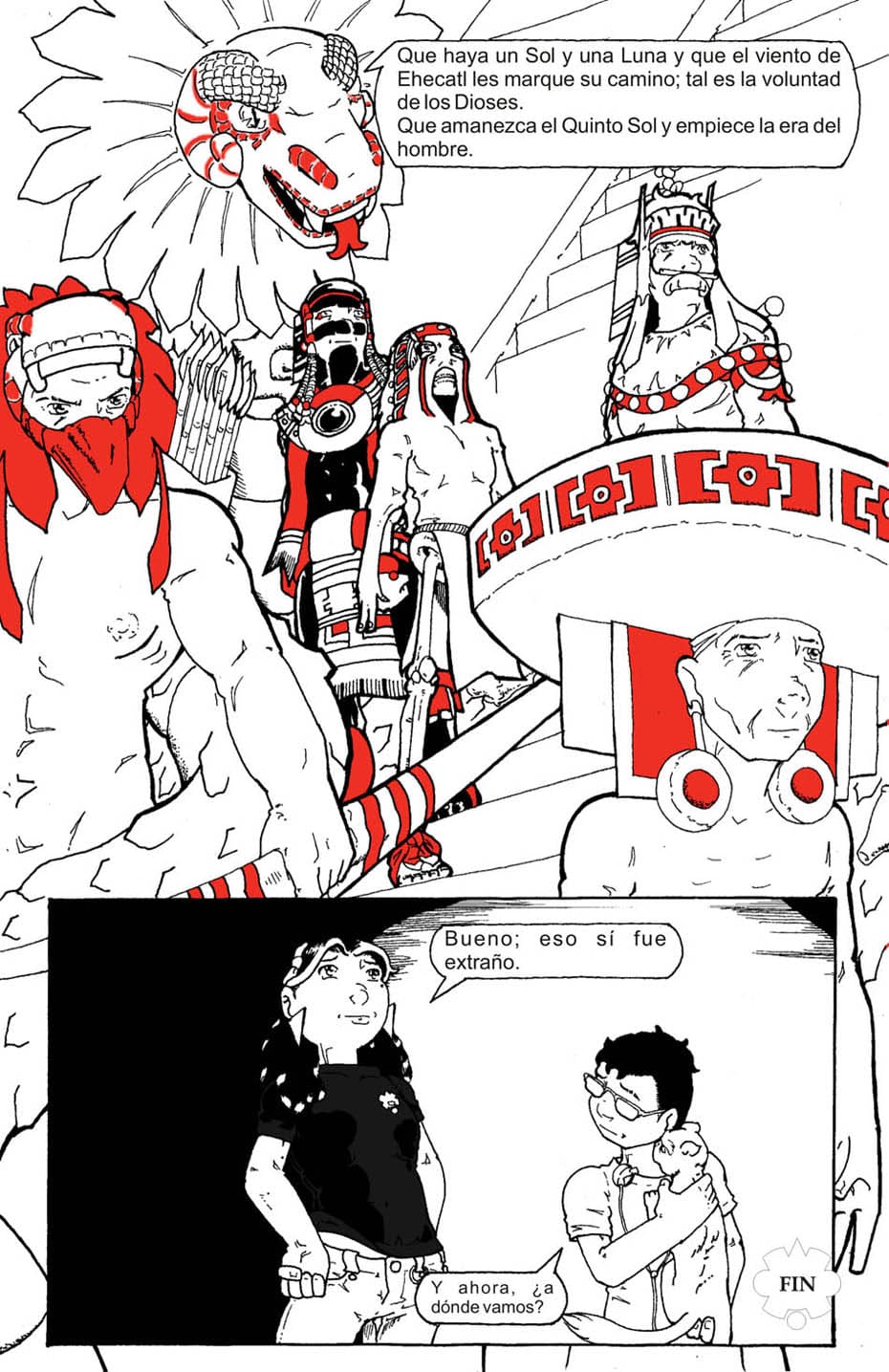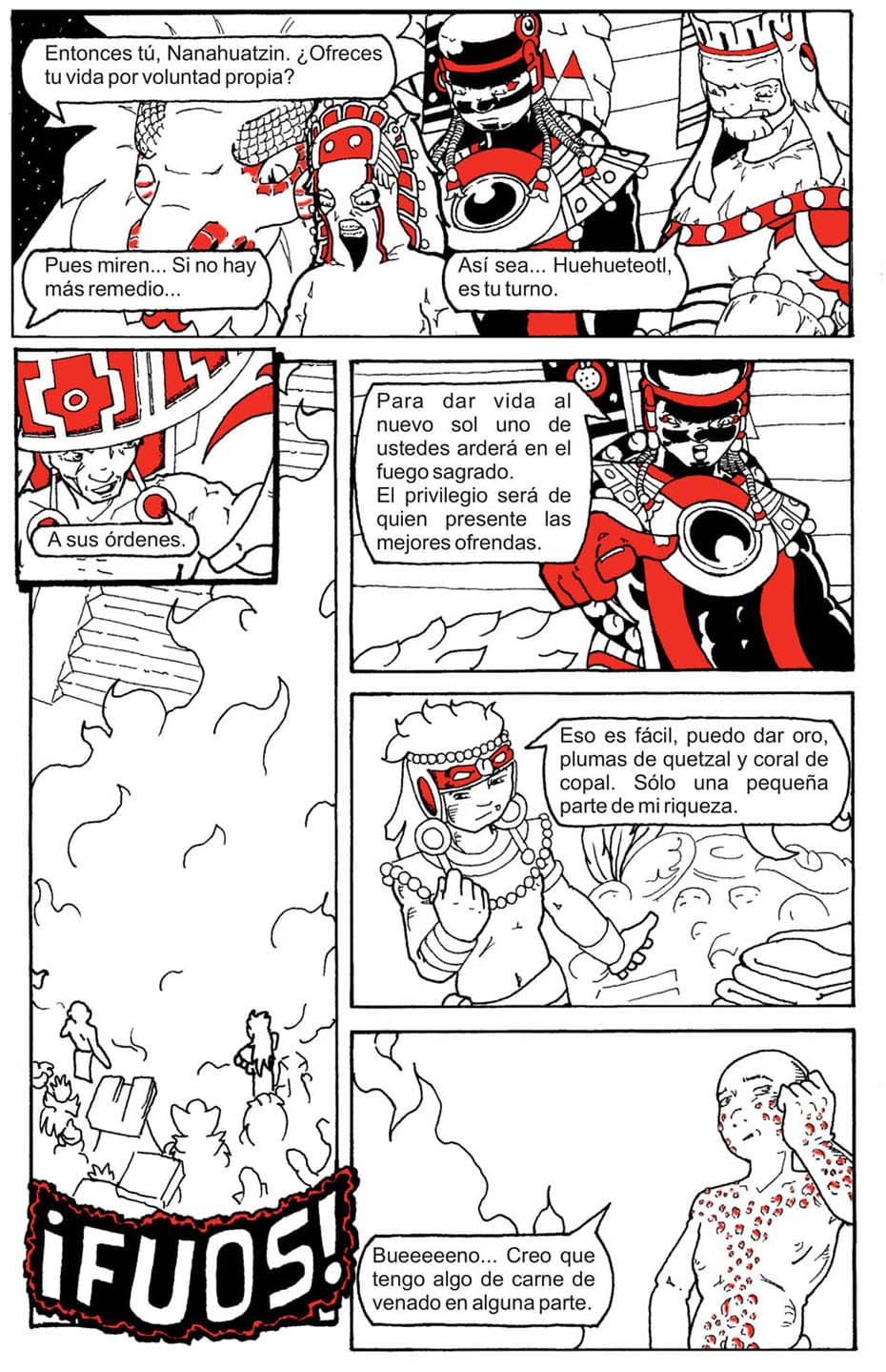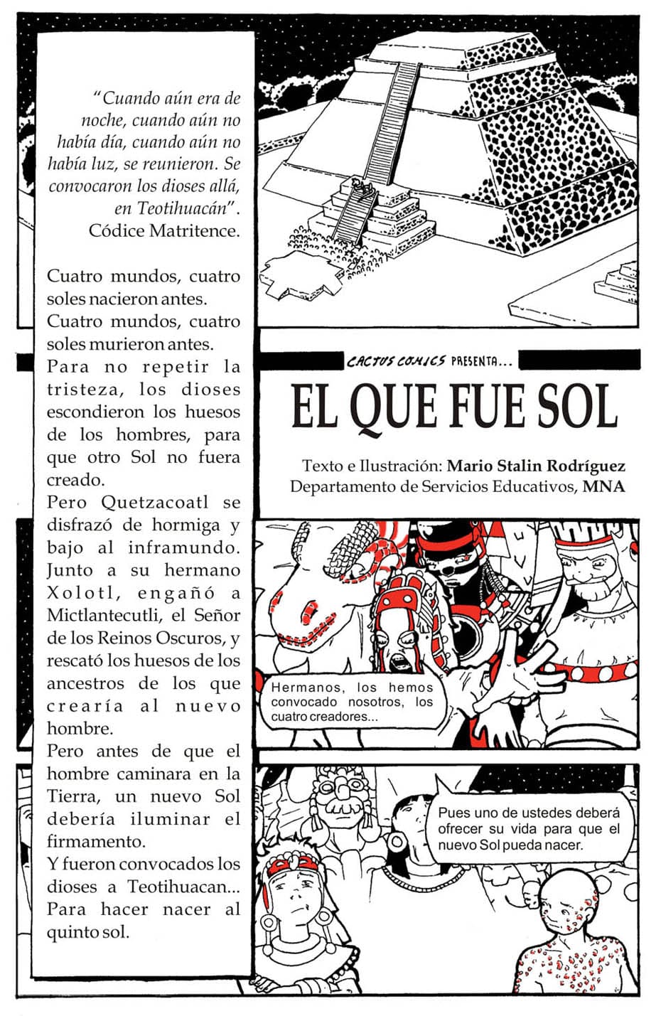 Trabajo en el Museo Nacional de Antropología en México, parte de mi trabajo es generar contenidos educativos. Un proyecto en este sentido era una serie de historietas sobre diversos mitos indígenas y pasajes de la historia precolombina. Proyecto que fue aprobado en su momento y para el que desarrollé el guión de los primeros cuatro episodios y empecé el trazo del primero.