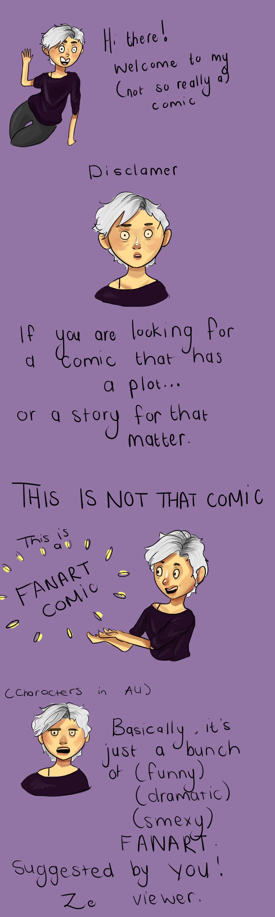 This is a "comic" all about fanart. Funny fanart. Au fanart. Dramativ fanart. Life-like fanart. Whatever your little geek heart desires. And you, the viewer, gets to choose what my next skit, or art pies or au will be.