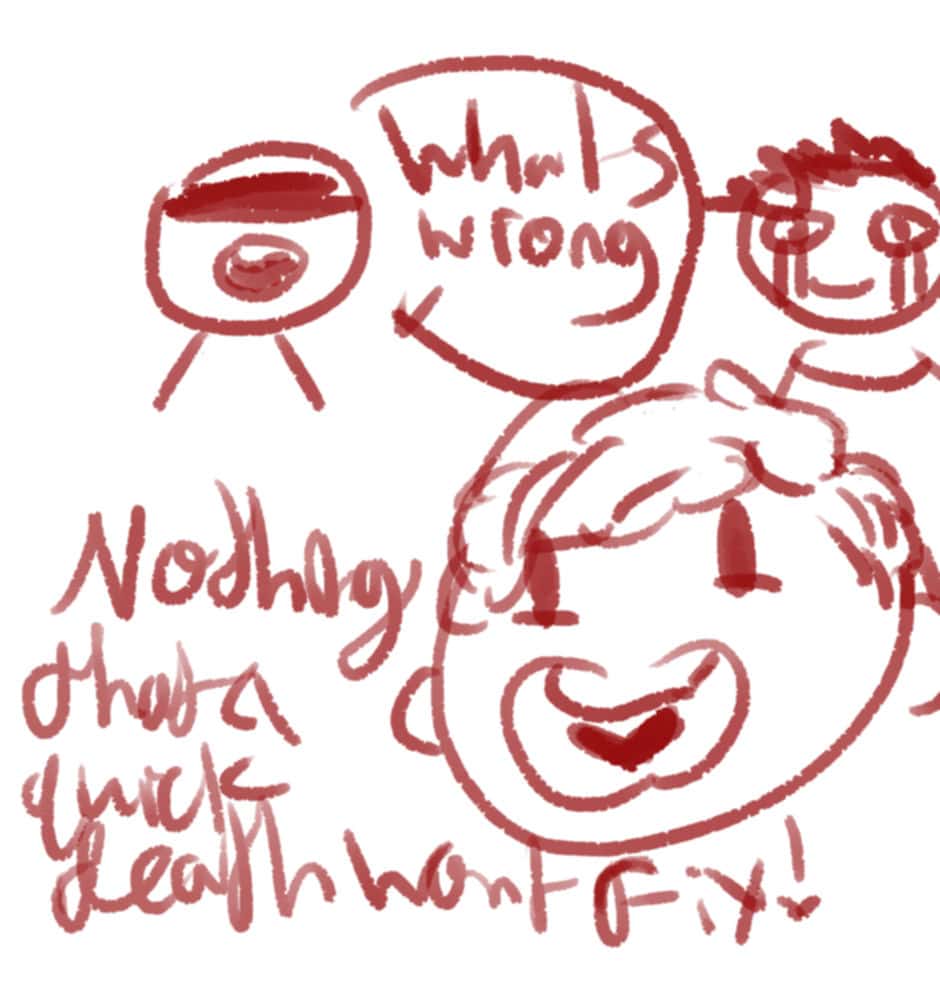 lmao i drew this in like 40secs so thats why its p shit, but also the bottom text says Nothing a quick death won't fix,, just if u can't read my messy hand writing lol