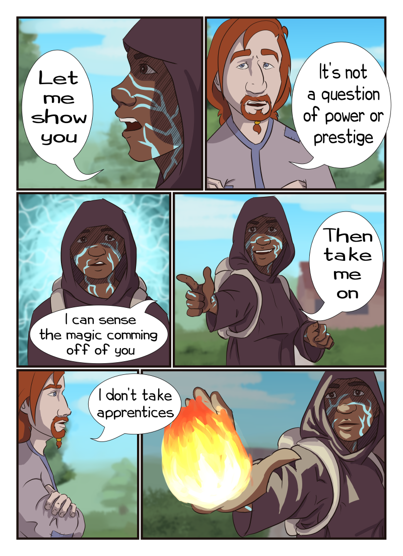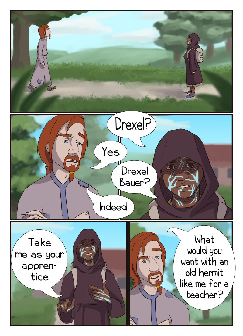 With patchy robes and concealing spells, no one would guess a small town's hermit, Drexel, to be the most powerful wizard who destroyed a large part of Resultum 23 years ago. Instead, he's more of a boogie man in Northwick. So he is surprised to meet Mira, a young woman who stubbornly wants to be his apprentice. He is more surprised to met Archimedes, a fortune teller with an easy, charming smile and a gift for seeing people. Will Drexel find healing and hope? Updates every other Monday. (themes of mental health issues)