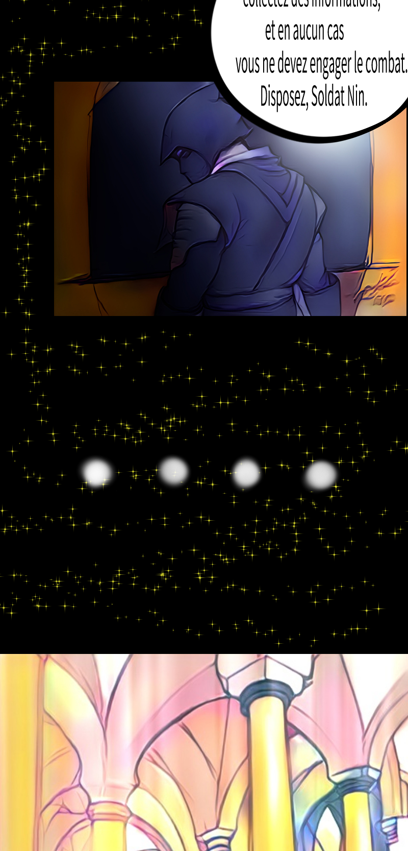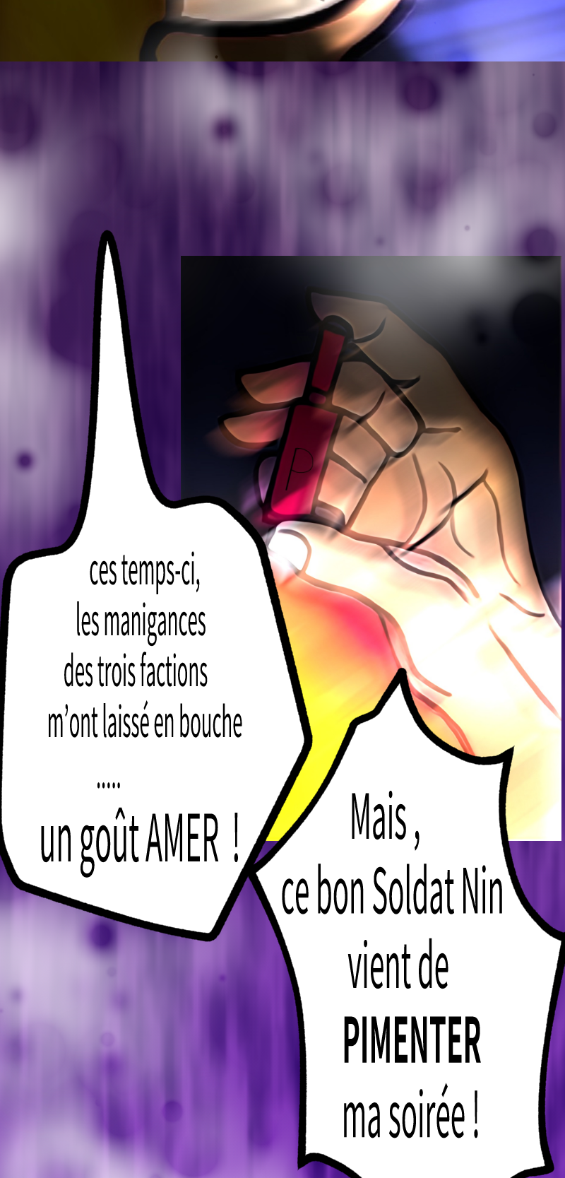 Le pouvoir, la richesse, l'ivresse, l’art, le combat, l’autorité suprême, l’intelligence, le succès, l’échec… Rien de tout cela n’a de valeur à mes yeux si je ne m’amuse pas. Laissez-moi vous faire briller de mille feux, ainsi je m’amuserai dans votre ombre.