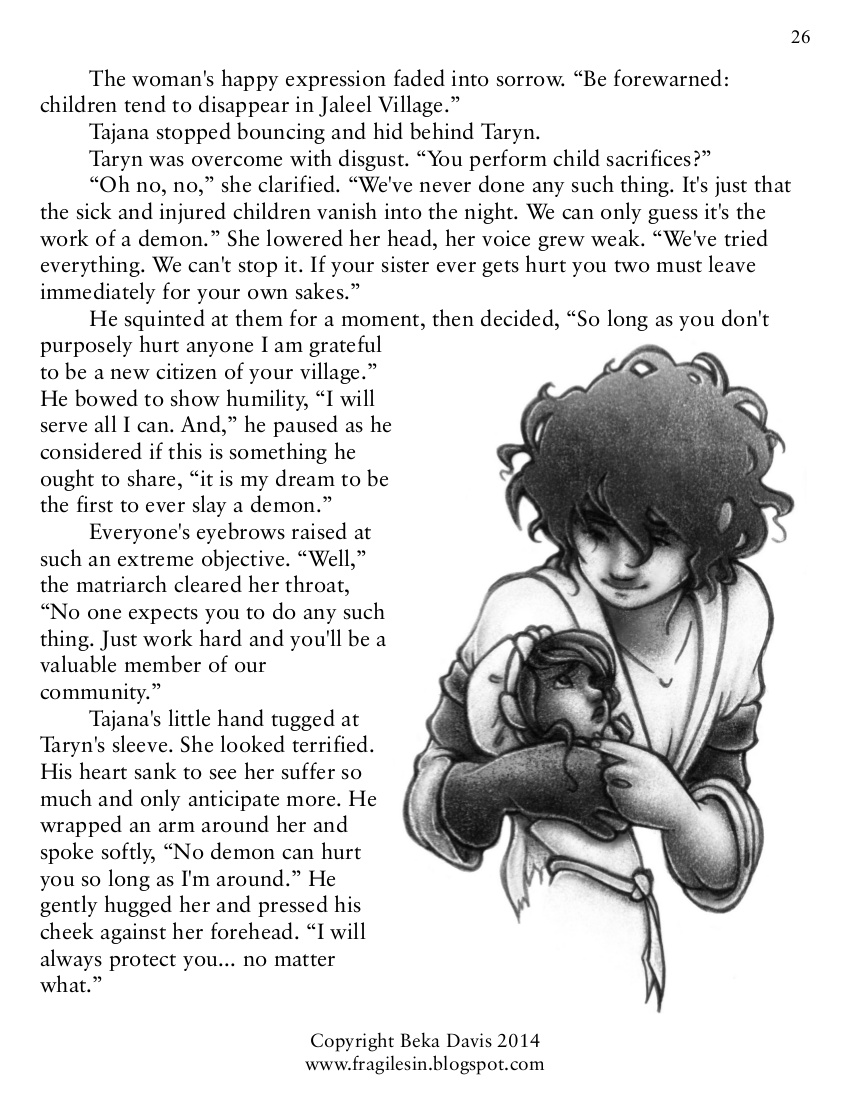Taryn and Tajana are searching for a new home after escaping from their human-sacrificing village, only to find one who is plagued by a demon with a taste for children.