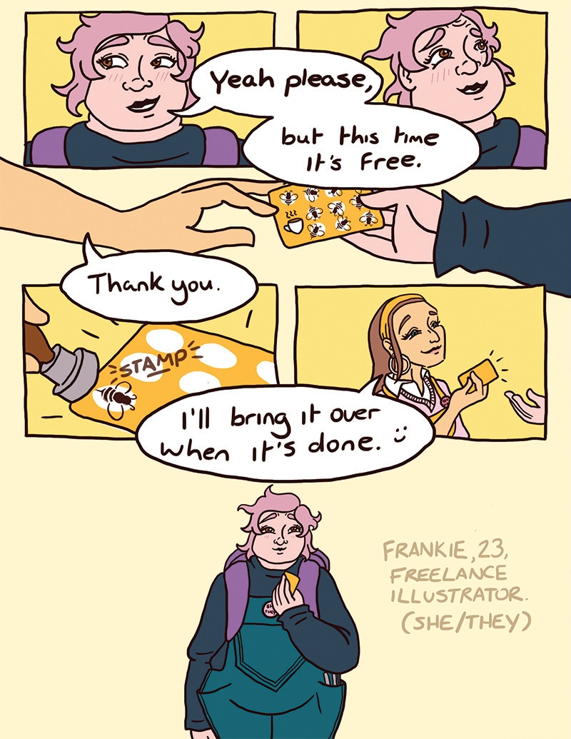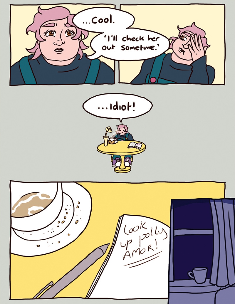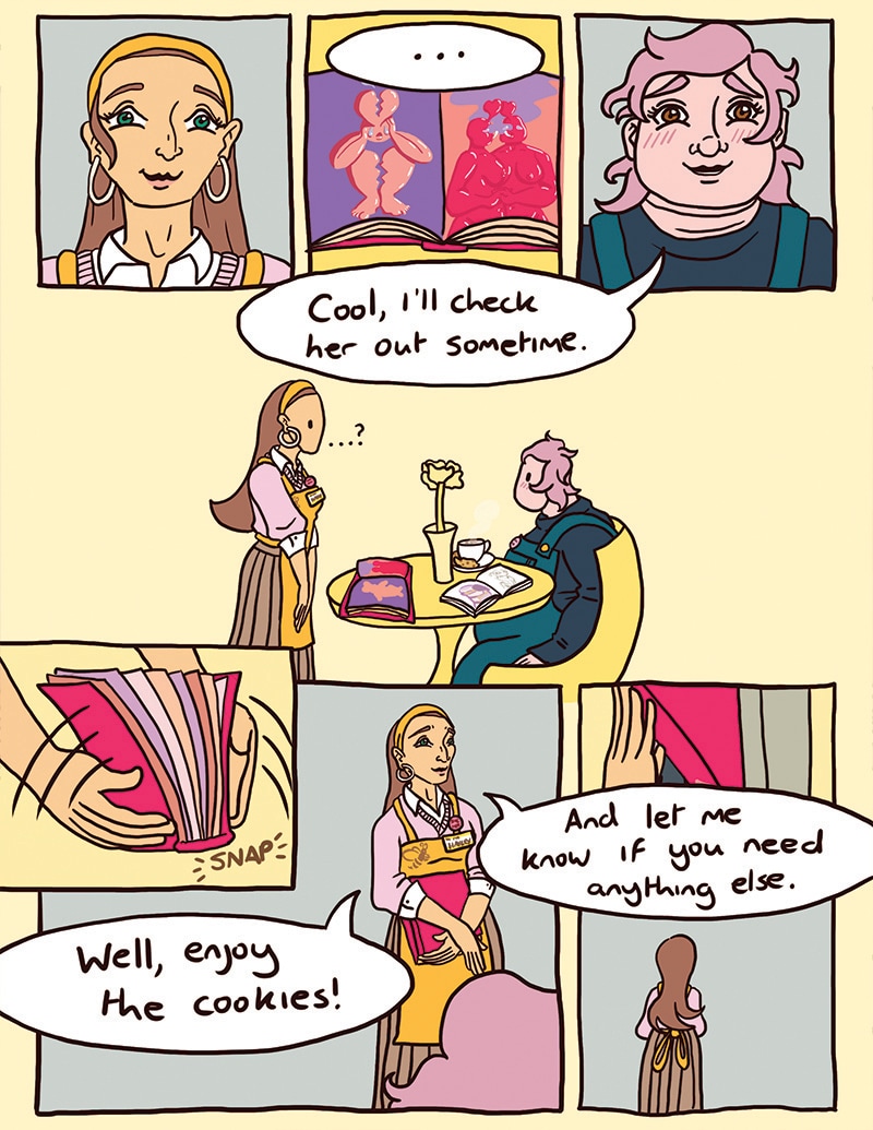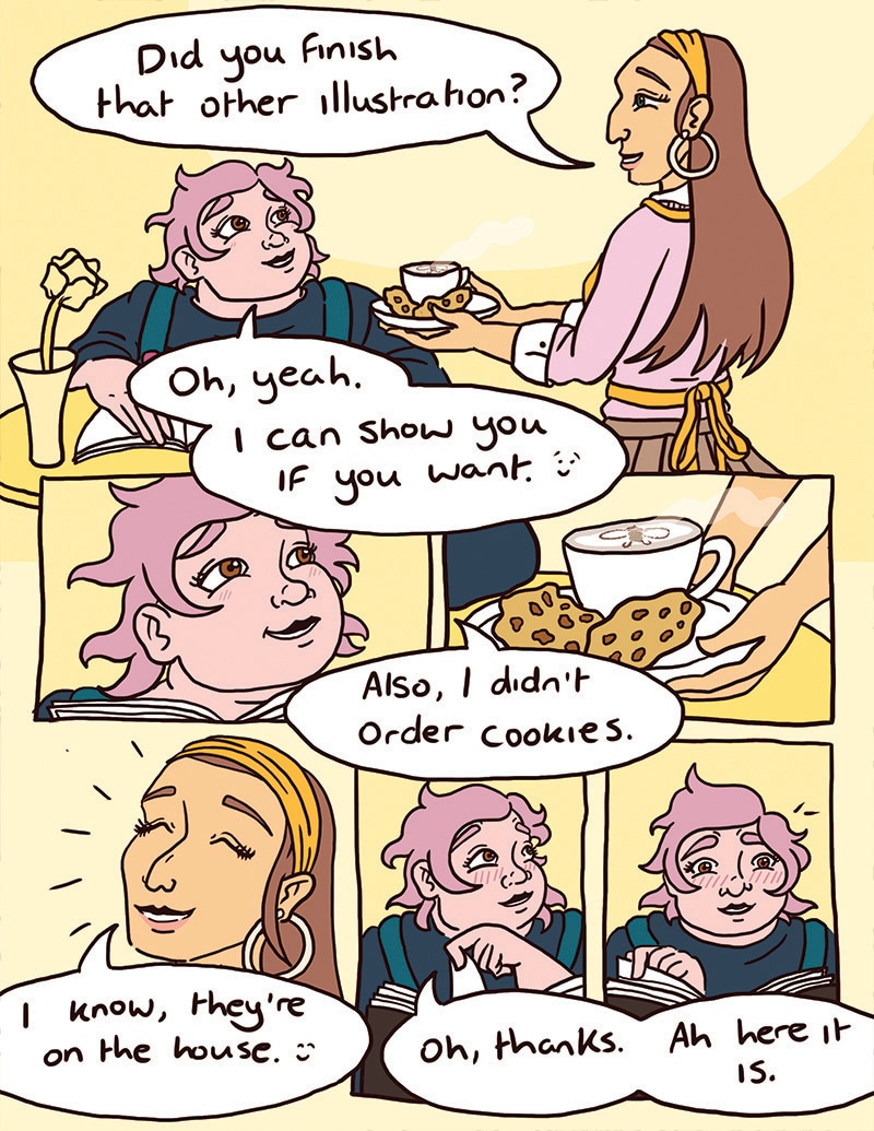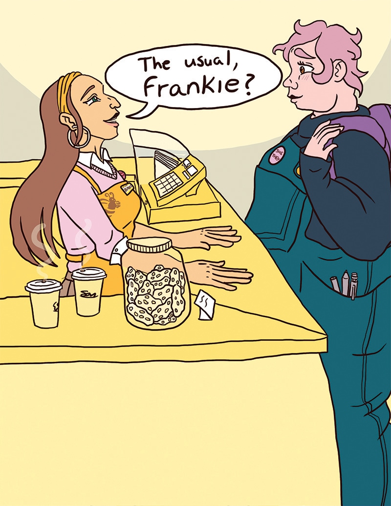 Frankie, an introverted enby lesbian, becomes a regular at a queer indie coffee shop, Busy Bean. The coffee’s great, the atmosphere’s relaxing, and the owner, Hayley, a bubbly lesbian, happens to be pretty cute.
