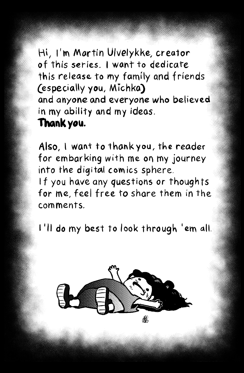 Thanks again for reading. Work on these pages began a long time ago and will serve as an overworked prelude to the rest of the pilot comic then the style will revert to something more manageable, closer to the cover page which is the most recent art drawn for the project.