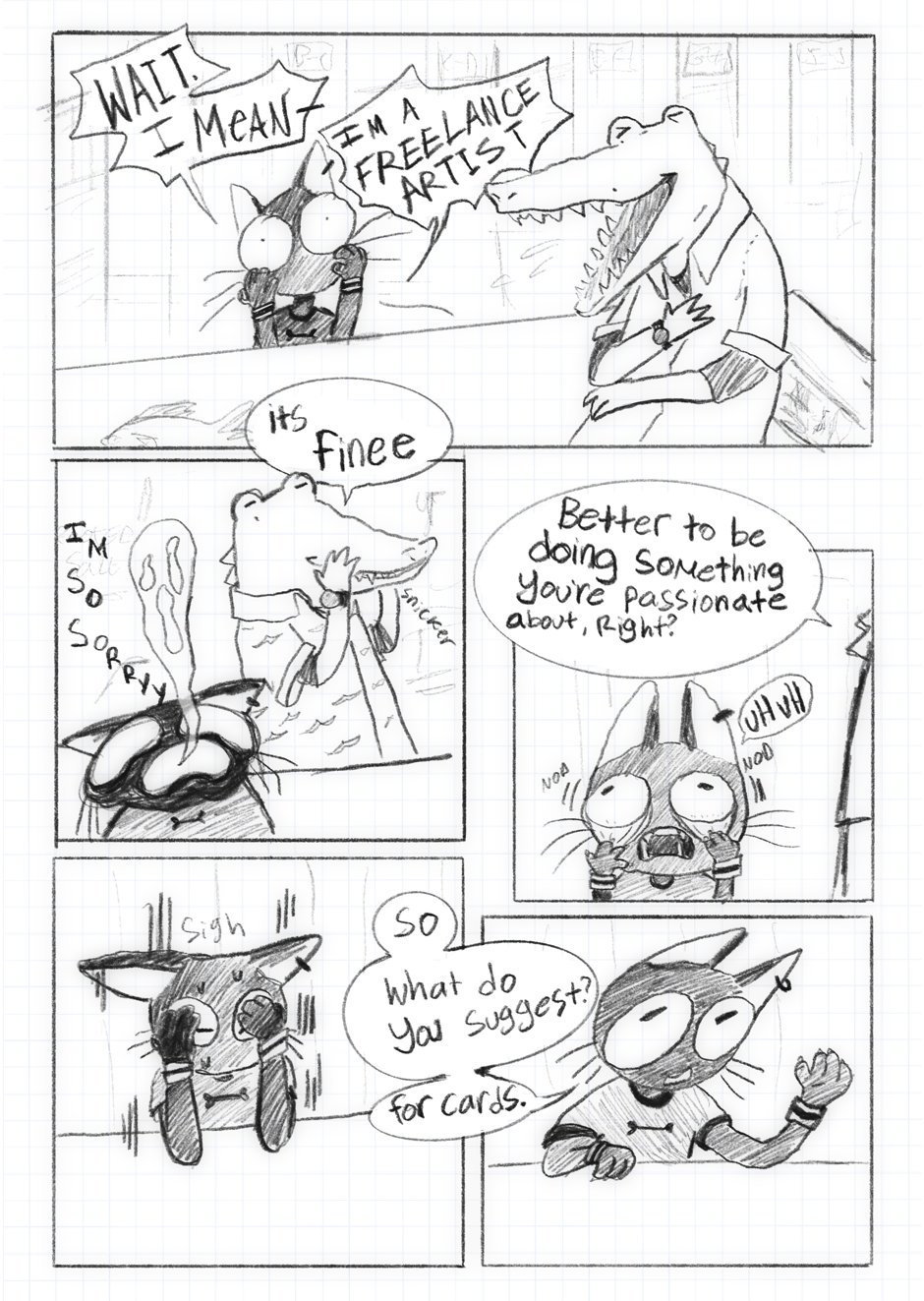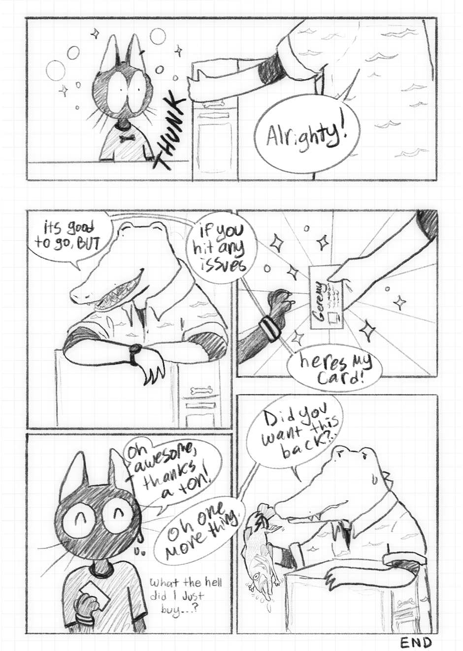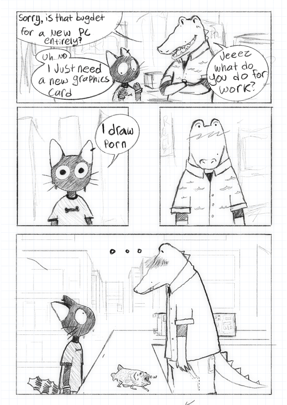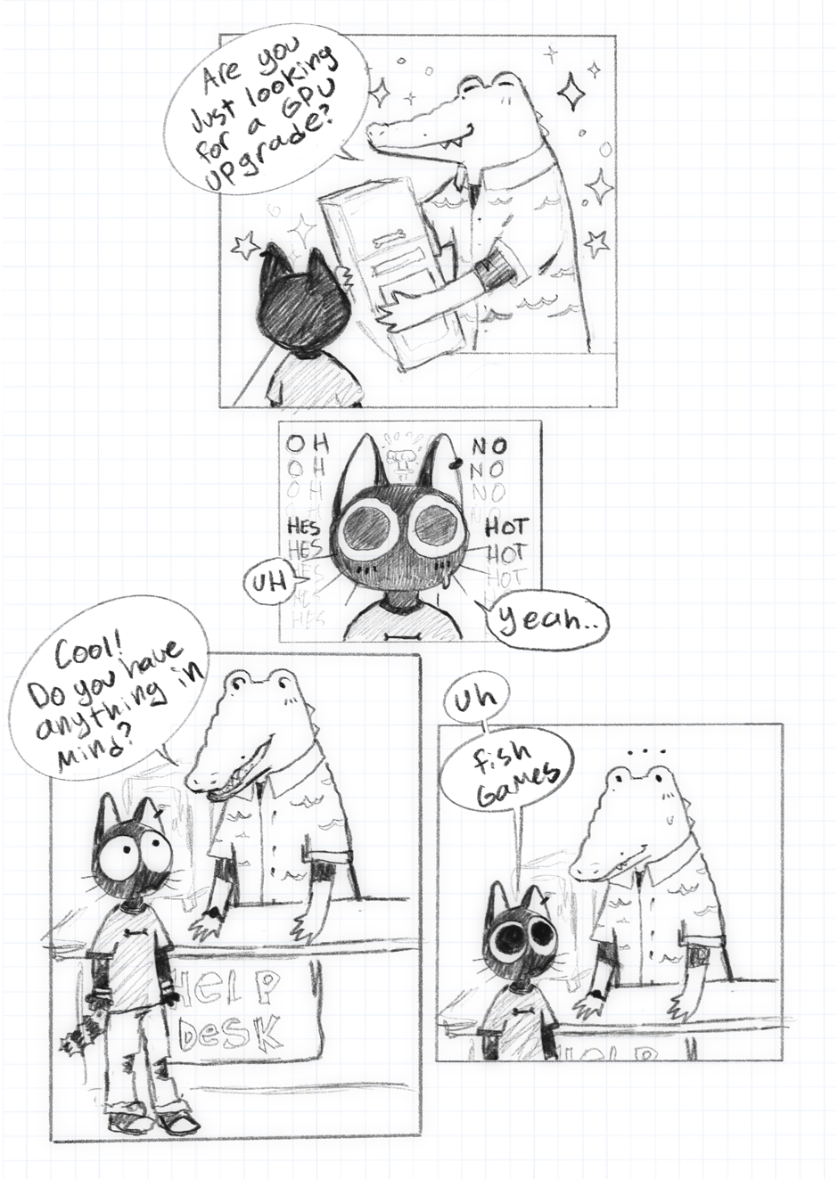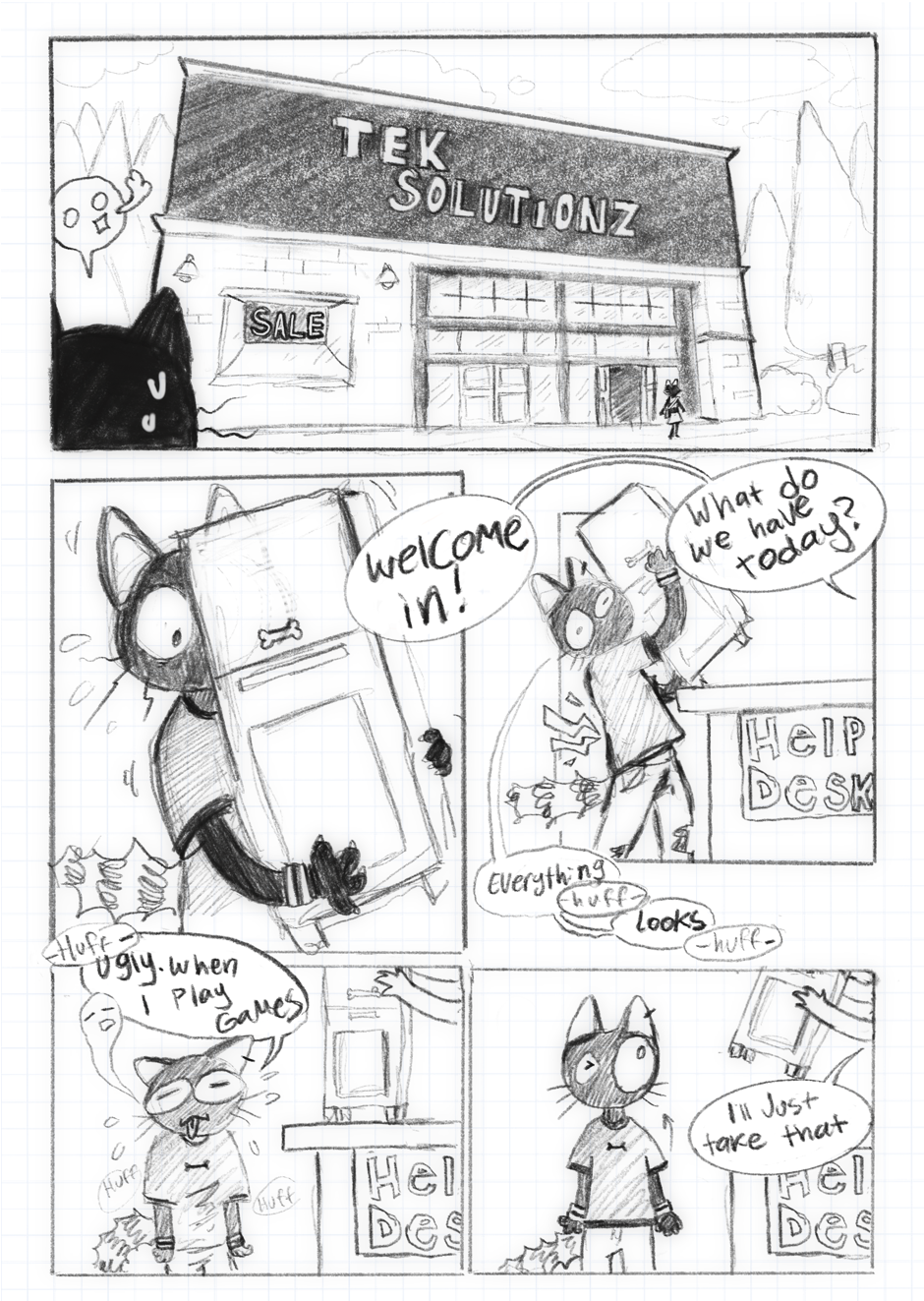 Javier(cat guy thing) is a work from home artist who doesn't get out much, on what was supposed to be a brief trip to a tech shop he discovers the love of his life...or honestly, he sees some hot guy on a random Tuesday afternoon. Suffer through watching this poorly socialized cat try to make connections!