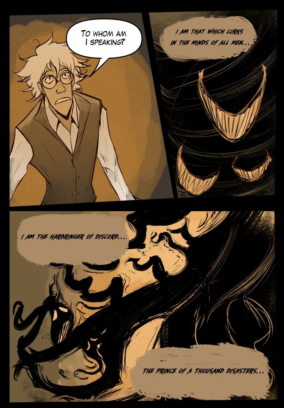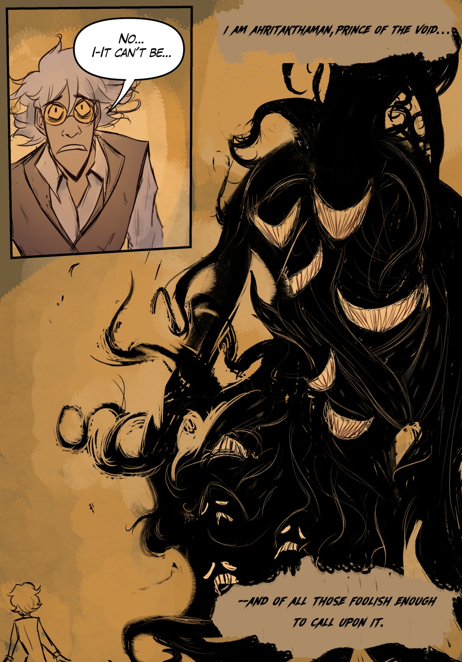 Unfortunately for him, he clumsily ends up summoning Ahritakthaman, the Prince of The Void. Thankfully, he's still able to make a deal with the deity--at a price of course. Now Emile's stuck being Ahritakthaman's servant--encountering eldritch creatures and other wacky cultists in the process.