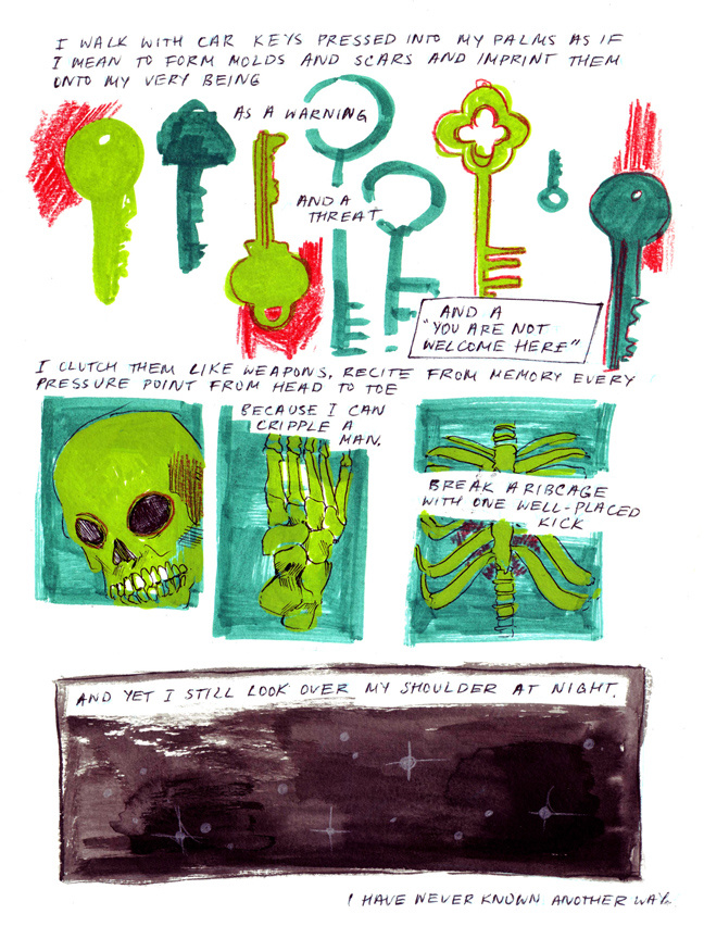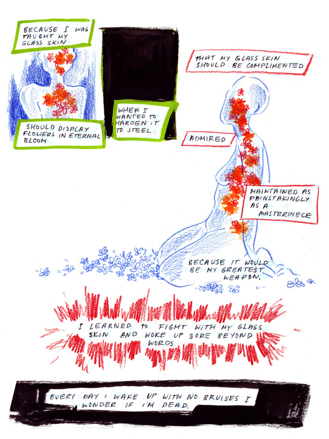 Short warmup comic I did to relax a bit. On scars, expectations of femininity and feeling like a stranger in your own body.