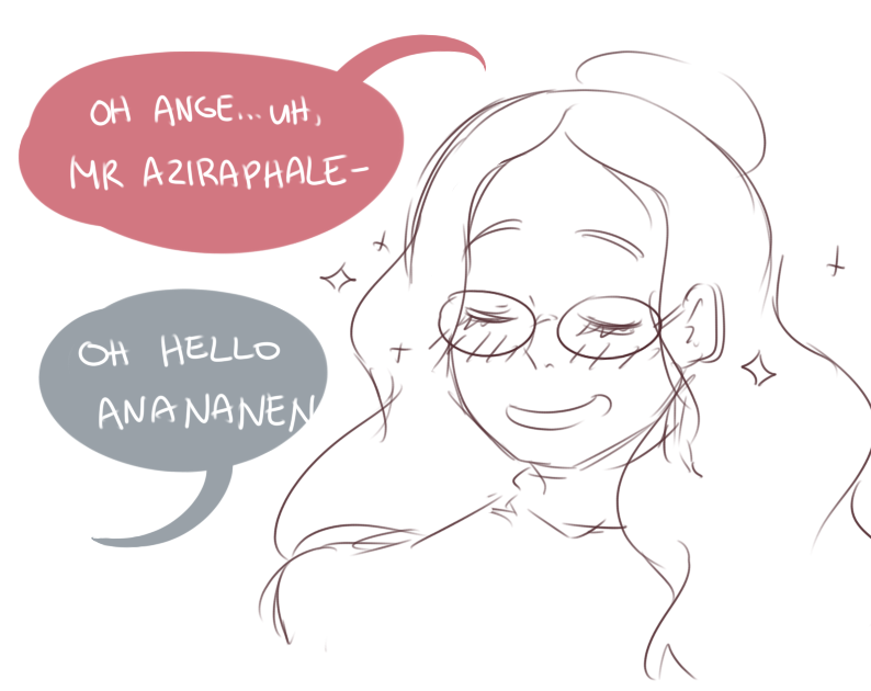 Crowley disguises as Anathema to prank Aziraphale Characters are from Good Omens, and they belong to Neil Gaiman and Terry Pratchett!