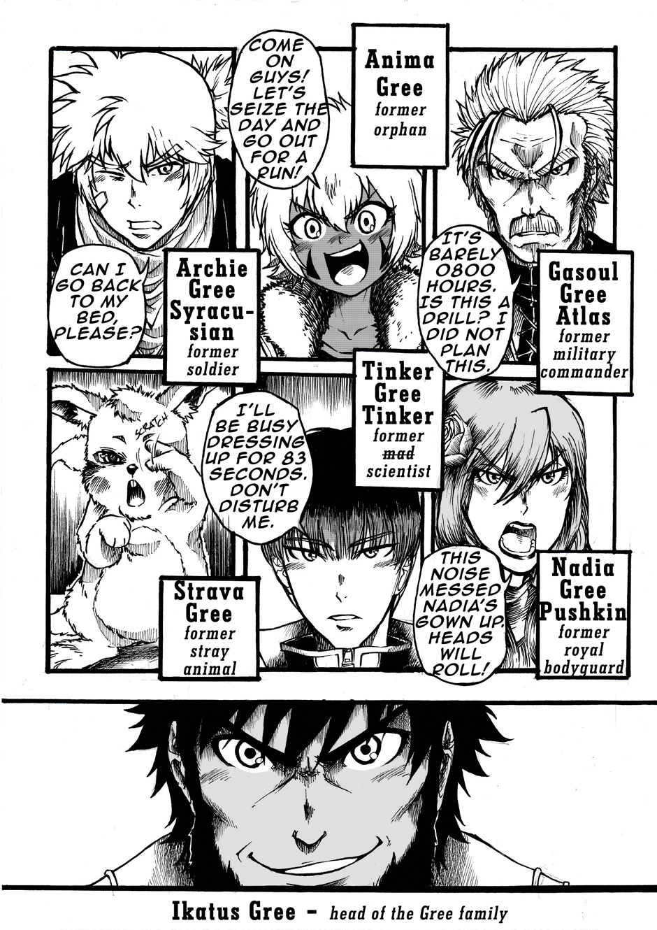 "If someone in need asks you to help them - do it!" - Such is the motto of the Gree family - a curious bunch who were "adopted" by a crazy old wizard named Ikatus Gree. Bound together by fate, they travel from place to place. Their vehicle and home? A pumpkin house inside a curved up tree. No matter where they go - trouble inexplicably follows. The Grees don't mind it though - they're always up for adventure!