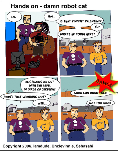 The very first Hands On comic ever, created after a particularly annoying level in Dirge of Cerberus which for the rest I felt was unfairly thrashed by the gaming press. Still, stealthing with a character thoroughly unsuited for stealth will enrage the best of us.