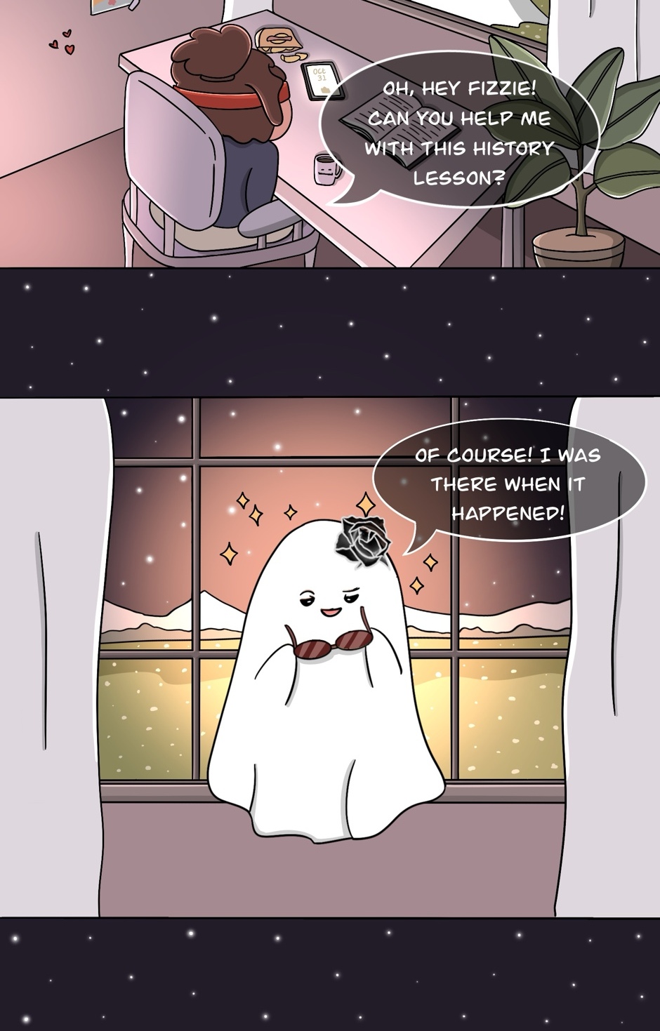 "Happily Haunted" is a sweet and sassy comic about Fizzie, a fun-loving ghost navigating the afterlife with humor, heart, and a dash of chaos. From funny mix-ups to witty antics, it's a charming peek into the not-so-ordinary life of everyone’s favorite spirit!